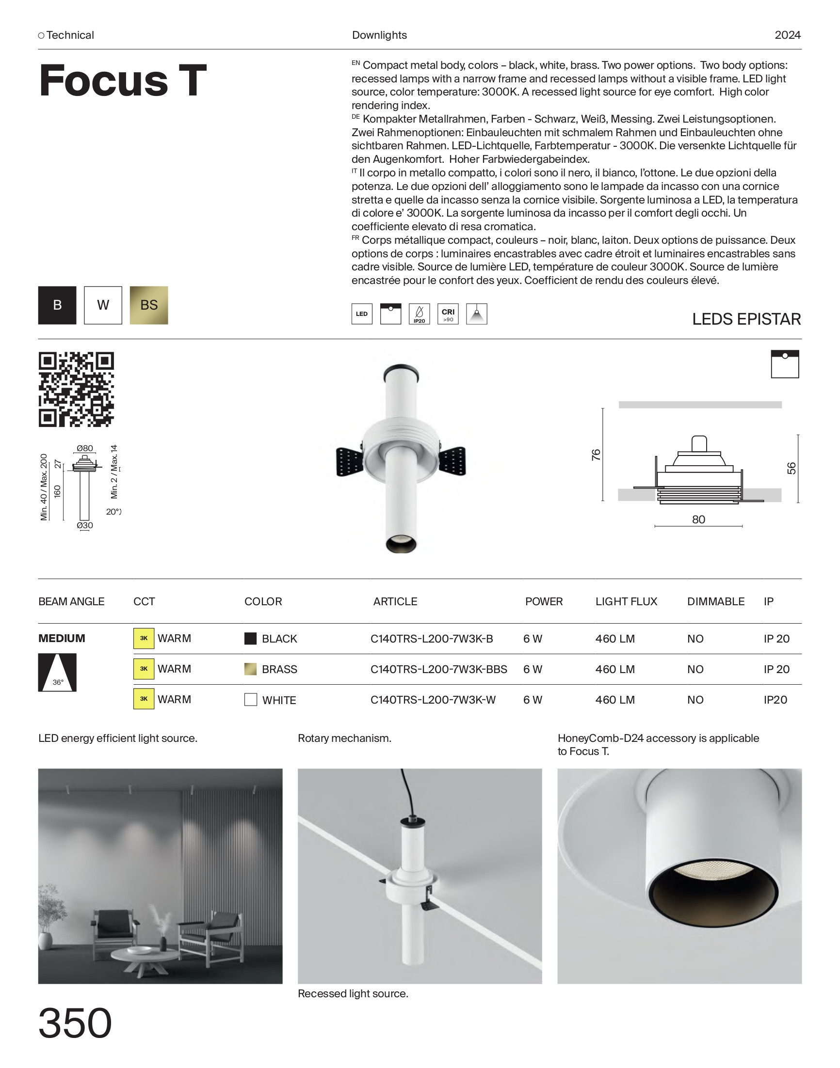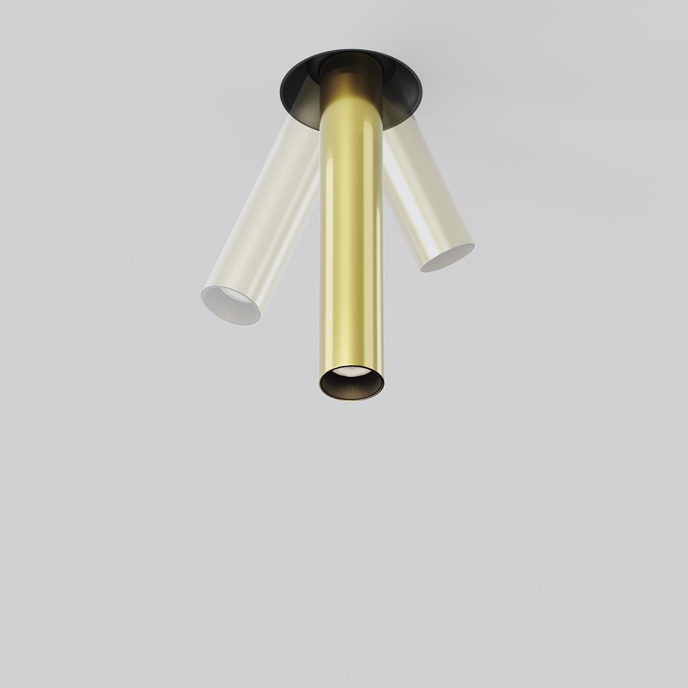 алуминий в цвят черно и месинг, възможност за накланяне до 20°, ъгъл на разсейване на светлината 36°, страничните планки с отворите се замазват към окачения таван