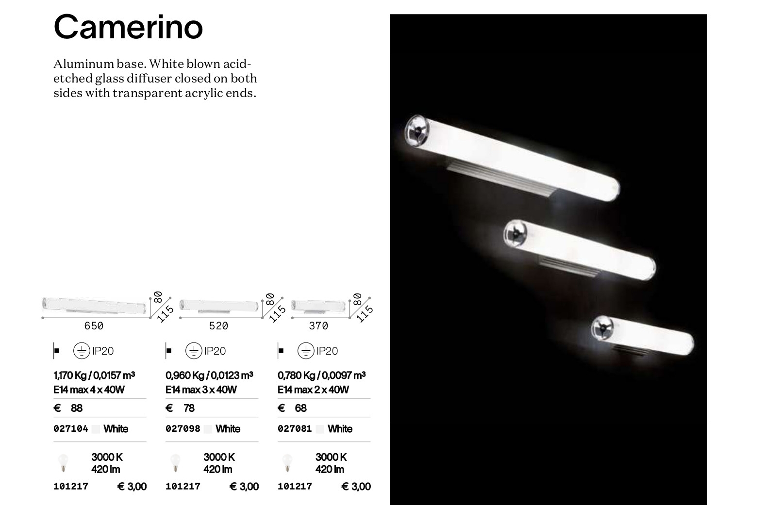Осветителното тяло CAMERINO AP3 ще осигури комфорт и естетика във всяко помещение, в което се постави. Цялостната визия и дизайн на лампата и вложените в изработката й материали, като основа от алуминий, дифузер от бяло издухано и ецвано с киселина стъкло, затворен от двете страни от прозрачни акрилни дискове, ще допринесат за един неповторим стил. Благодарение на дългогодишния опит, качествените материали и строгия контрол на качеството на изработка на производителя Ideal-Lux (Италия), CAMERINO AP3 е на високо европейско ниво.