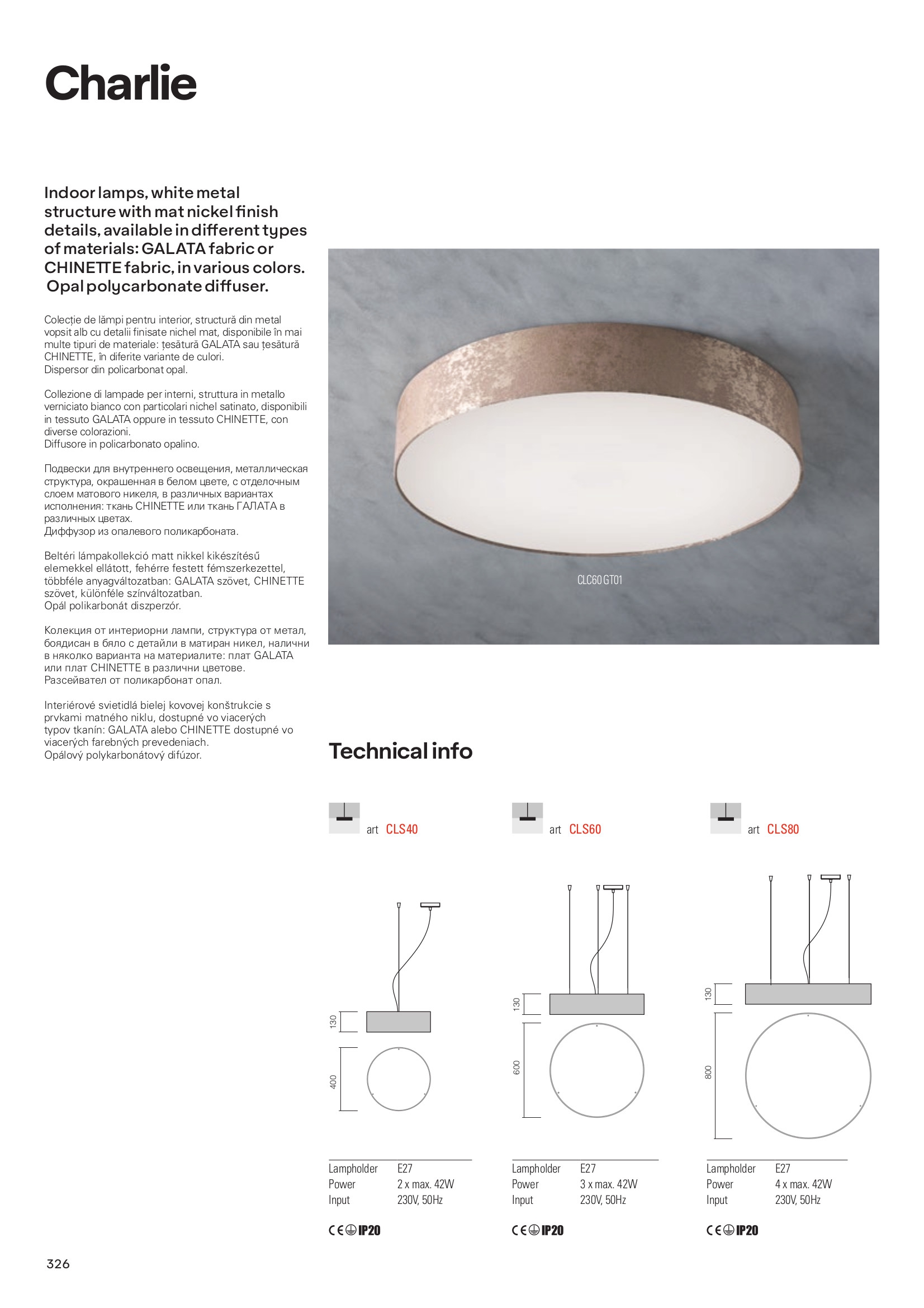 метал в бял цвят с детайли в цвят матиран никел, налични в различни цветове и два вида плат: Galata и Chinette, в случая е с плат Chinette CN04, дифузер от полимер в цвят бял опал