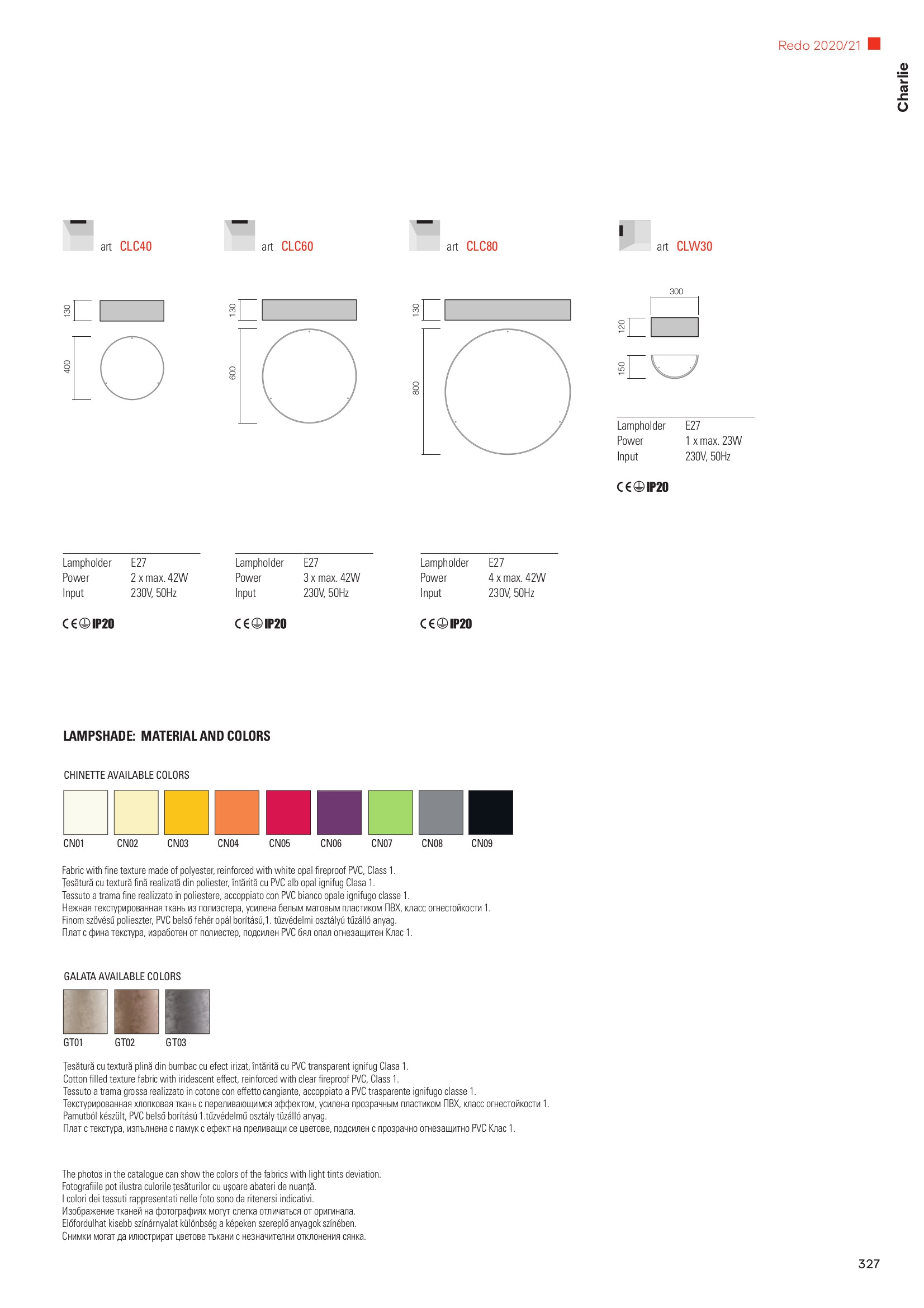 Осветителното тяло CLW30 GT ще осигури комфорт и естетика във всяко помещение, в което се постави. Цялостната визия и дизайн на лампата и вложените в изработката й материали, като метал в бял цвят с детайли в цвят матиран никел, налични в различни цветове и два вида плат: Galata и Chinette, в случая е с плат Galata GT03, дифузер от полимер в цвят бял опал, ще допринесат за един неповторим стил. Благодарение на дългогодишния опит, качествените материали и строгия контрол на качеството на изработка на дизайнерската линия Redo Indoor на производителя Redo (Румъния), CLW30 GT е на високо европейско ниво.