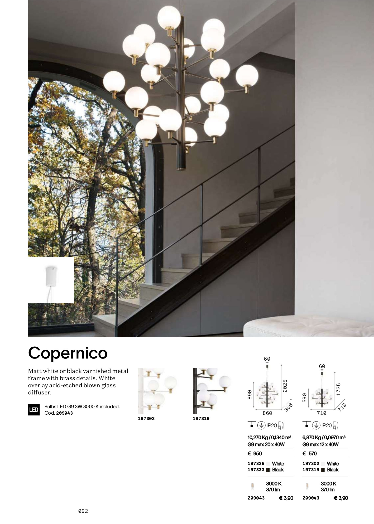 Осветителното тяло COPERNICO SP20 BIANCO ще осигури комфорт и естетика във всяко помещение, в което се постави. Цялостната визия и дизайн на лампата и вложените в изработката й материали, като бяла лакирана метална рамка с месингови детайли, разсейватели от издухано стъкло с киселинно ецване в млечно бял цвят, ще допринесат за един неповторим стил. Благодарение на дългогодишния опит, качествените материали и строгия контрол на качеството на изработка на производителя Ideal-Lux (Италия), COPERNICO SP20 BIANCO е на високо европейско ниво.