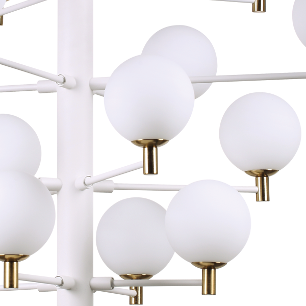 бяла лакирана метална рамка с месингови детайли, разсейватели от издухано стъкло с киселинно ецване в млечно бял цвят