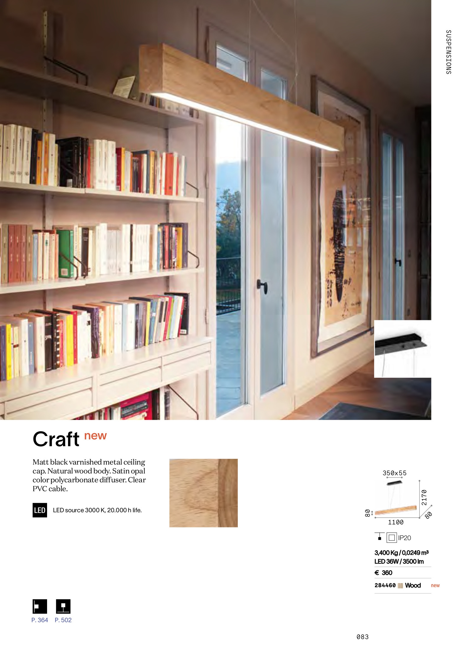 Осветителното тяло CRAFT SP ще осигури комфорт и естетика във всяко помещение, в което се постави. Цялостната визия и дизайн на лампата и вложените в изработката й материали, като таванна розетка от метал в матово черно, корпус от естествено дърво, дифузер от сатениран полимер в цвят бял опал, прозрачен PVC кабел, ще допринесат за един неповторим стил. Благодарение на дългогодишния опит, качествените материали и строгия контрол на качеството на изработка на производителя Ideal-Lux (Италия), CRAFT SP е на високо европейско ниво.