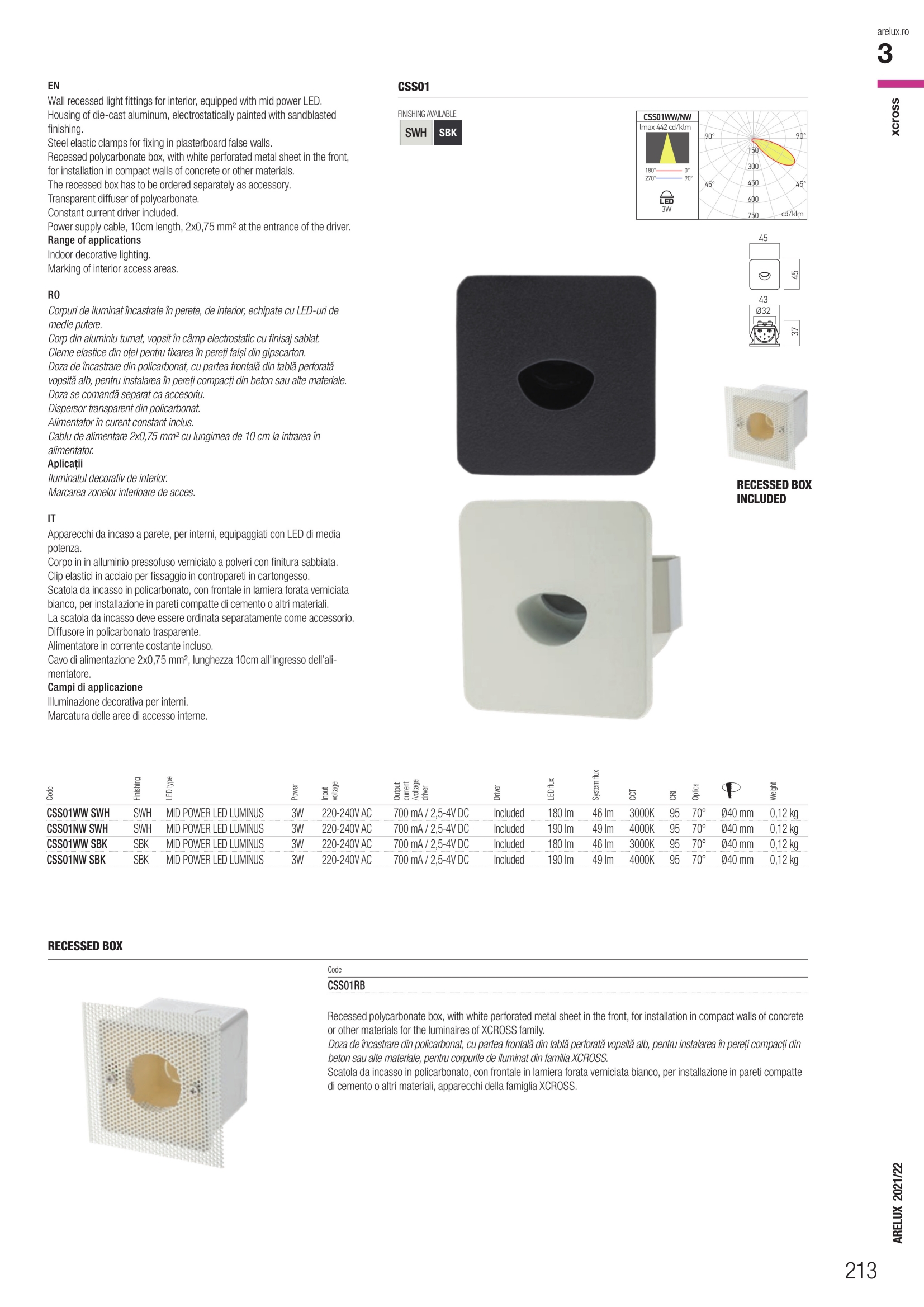 Лед аплик CSS01NW SWH ще осигури комфорт и естетика във всяко помещение, в което се постави. Цялостната визия и дизайн на led лампата и вложените в изработката й материали, като лят алуминий с електростатично нанесено пясъкоструйно покритие в бяло, скоби за закрепване към стени от гипсокартон прозрачен дифузьор от поликарбонат, ще допринесат за един неповторим стил. Благодарение на дългогодишния опит в производството на лед осветление, качествените материали и строгия контрол на качеството на изработка на дизайнерската линия Redo Arelux на производителя Redo (Румъния), CSS01NW SWH е на високо европейско ниво.