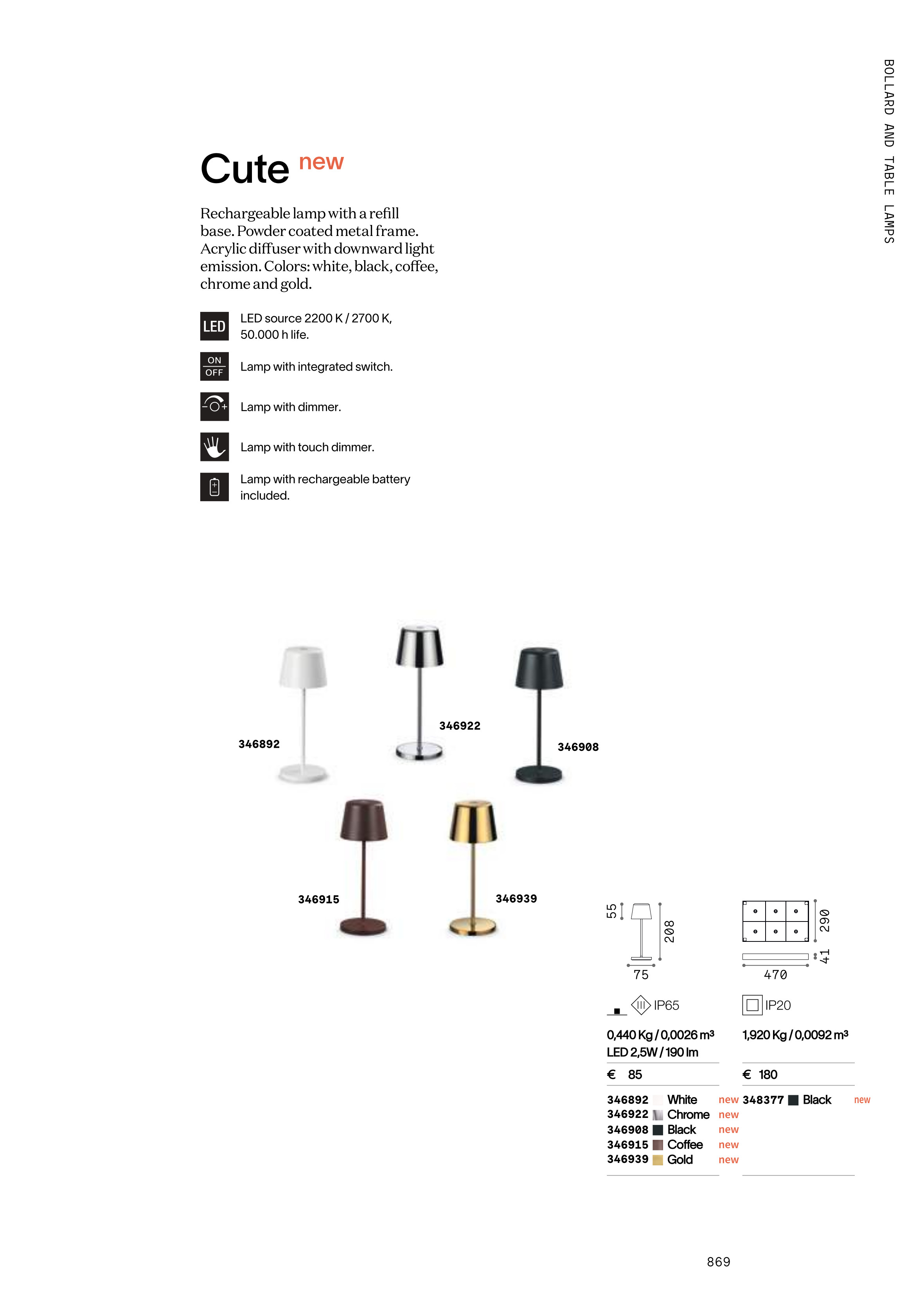 Осветителното тяло CUTE TL NERO представлява лед настолна лампа в съвременен стил. CUTE TL NERO е от категорията и е подходящо за осветяване на различни помещения и пространства като: всекидневна / хол, спалня, трапезария, офис, външно осветление.