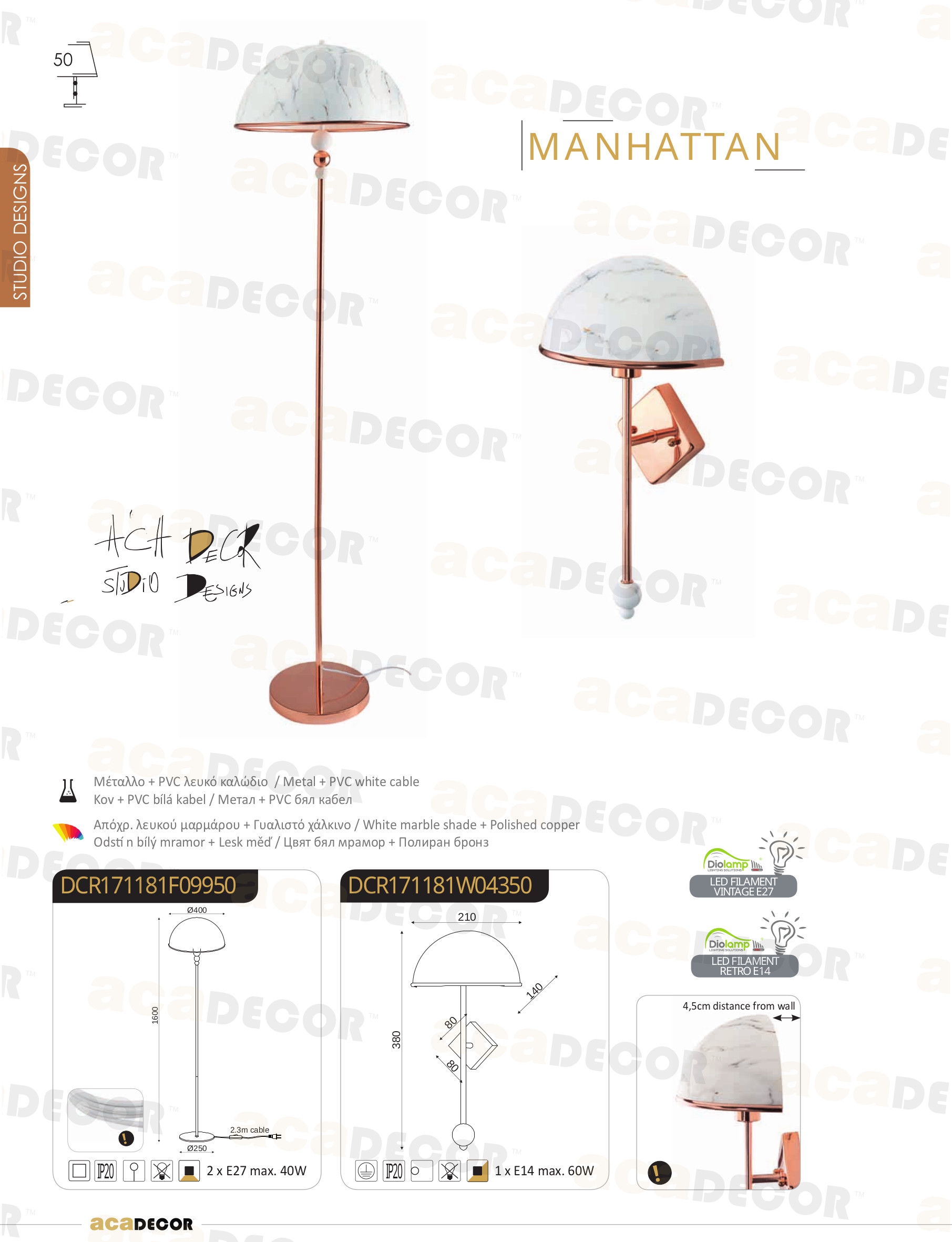 Осветителното тяло DCR171181W ще осигури комфорт и естетика във всяко помещение, в което се постави. Цялостната визия и дизайн на лампата и вложените в изработката й материали, като метал в цвят бял мрамор, полиран бронз, ще допринесат за един неповторим стил. Благодарение на дългогодишния опит, качествените материали и строгия контрол на качеството на изработка на производителя ACA-Lighting (Гърция), DCR171181W е на високо европейско ниво.