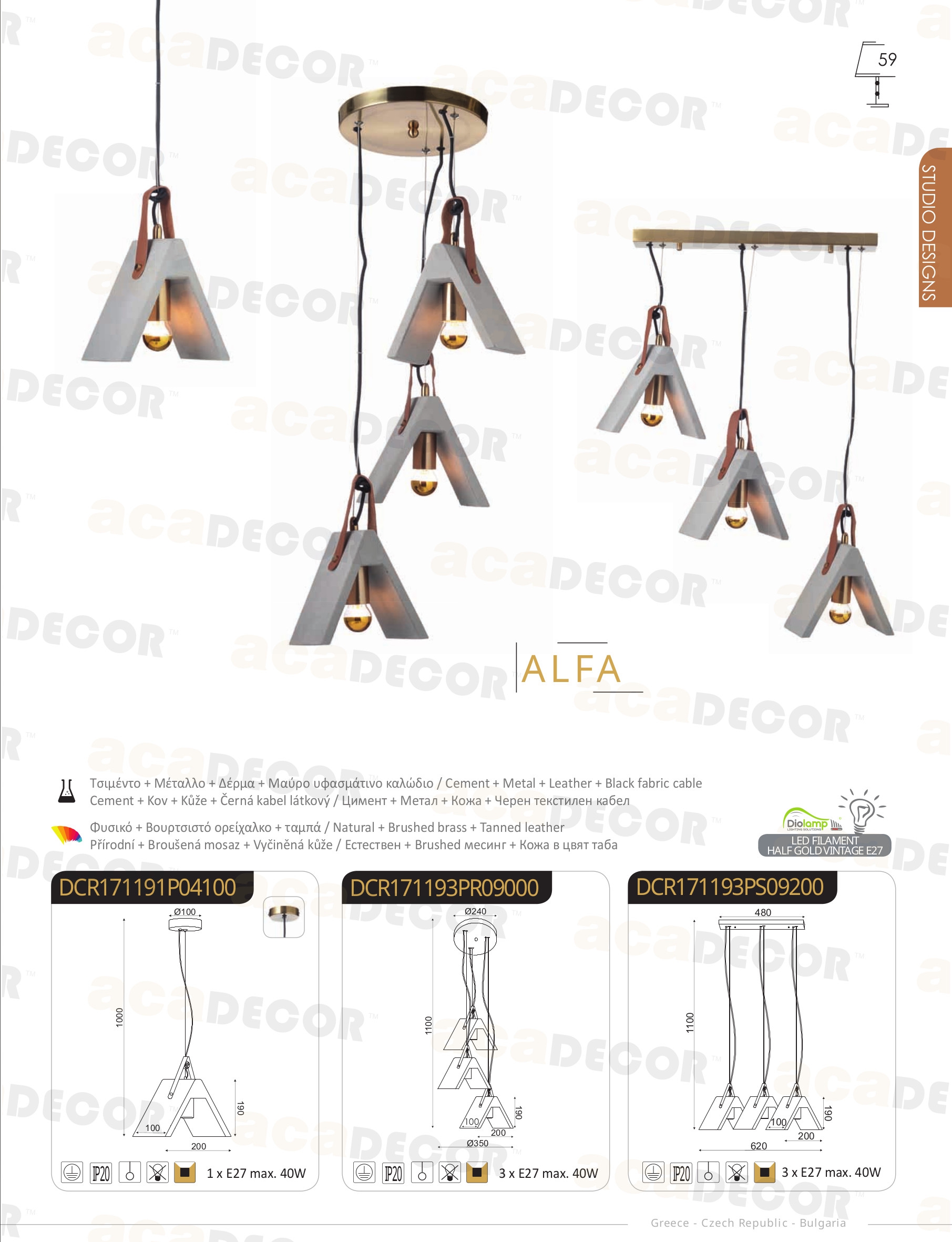 Осветителното тяло DCR171193PR ще осигури комфорт и естетика във всяко помещение, в което се постави. Цялостната визия и дизайн на лампата и вложените в изработката й материали, като цимент, кожа в цвят таба, месинг, ще допринесат за един неповторим стил. Благодарение на дългогодишния опит, качествените материали и строгия контрол на качеството на изработка на производителя ACA-Lighting (Гърция), DCR171193PR е на високо европейско ниво.