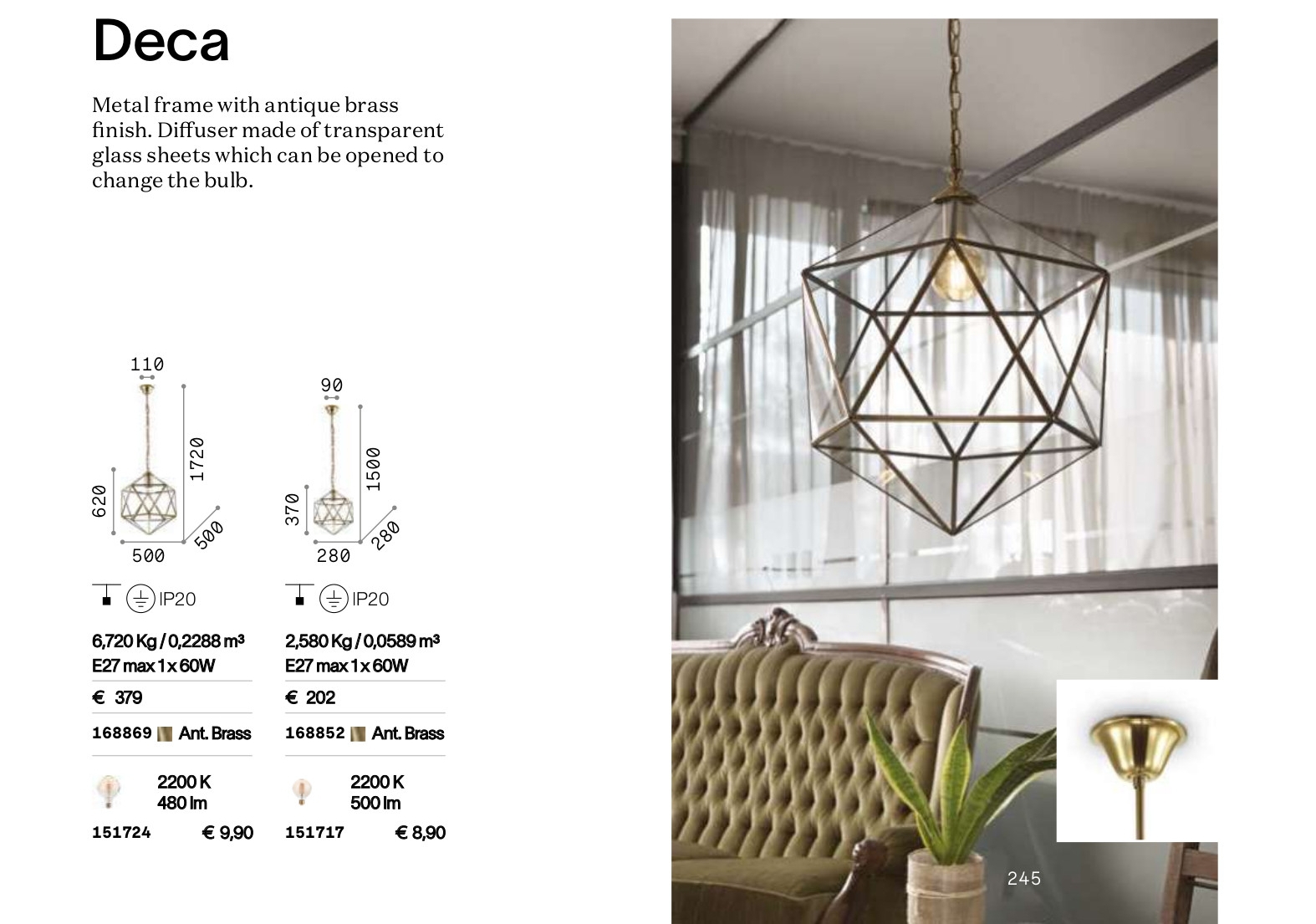 Осветителното тяло DECA SP1 SMALL ще осигури комфорт и естетика във всяко помещение, в което се постави. Цялостната визия и дизайн на лампата и вложените в изработката й материали, като метал с покритие от античен месинг, прозрачно стъкло, ще допринесат за един неповторим стил. Благодарение на дългогодишния опит, качествените материали и строгия контрол на качеството на изработка на производителя Ideal-Lux (Италия), DECA SP1 SMALL е на високо европейско ниво.