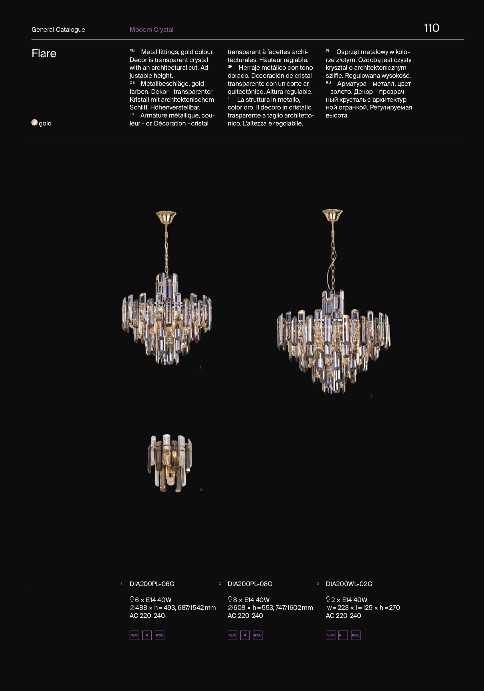 Осветителното тяло DIA200WL-02G ще осигури комфорт и естетика във всяко помещение, в което се постави. Цялостната визия и дизайн на лампата и вложените в изработката й материали, като метал в цвят злато, масивни кристални скосени призми, ще допринесат за един неповторим стил. Благодарение на дългогодишния опит, качествените материали и строгия контрол на качеството на изработка на производителя Maytoni (Германия), DIA200WL-02G е на високо европейско ниво.