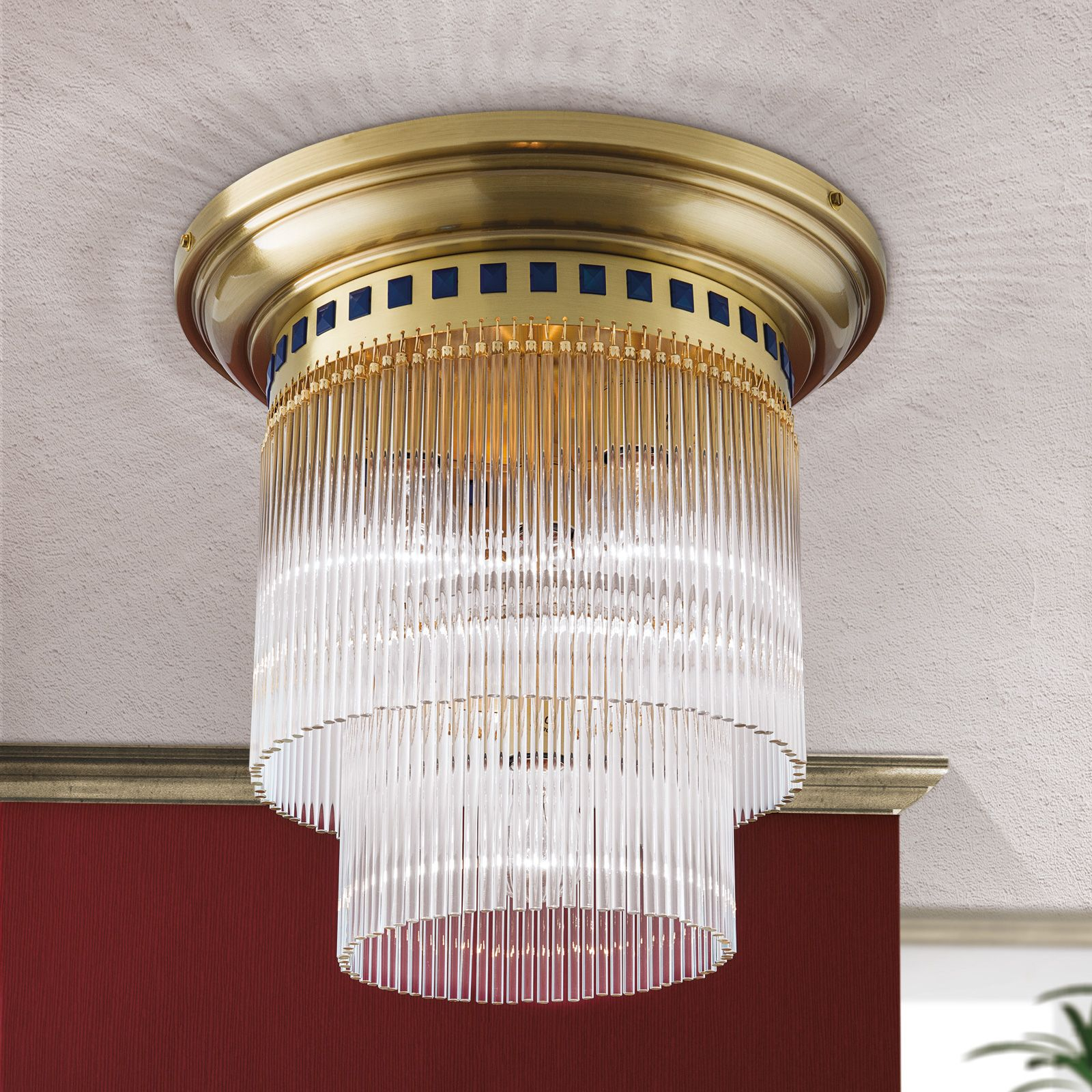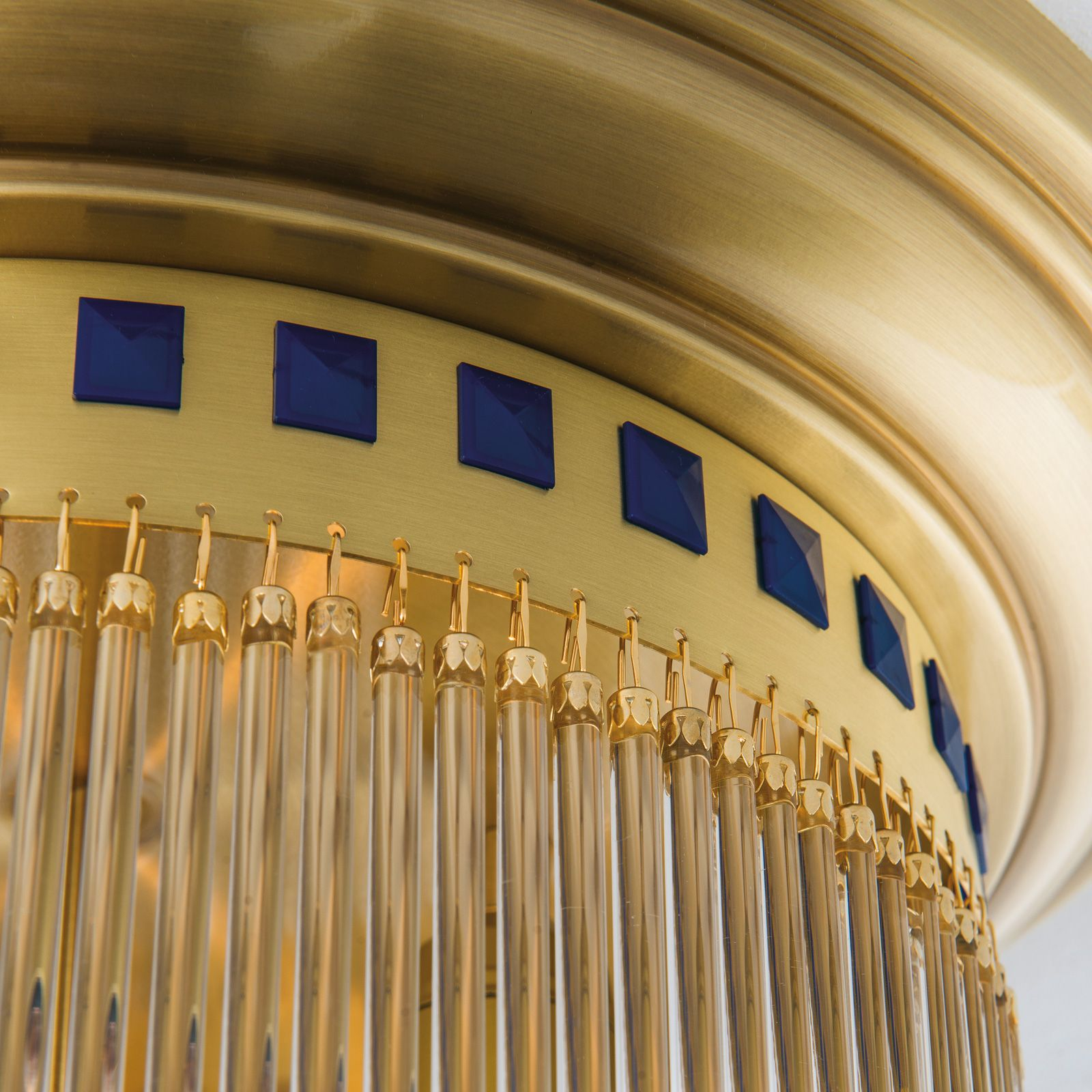 масивен месингс покритие в цвят бронз, цилиндрични стъклени призми, тъмно сини акрилни пирамиди