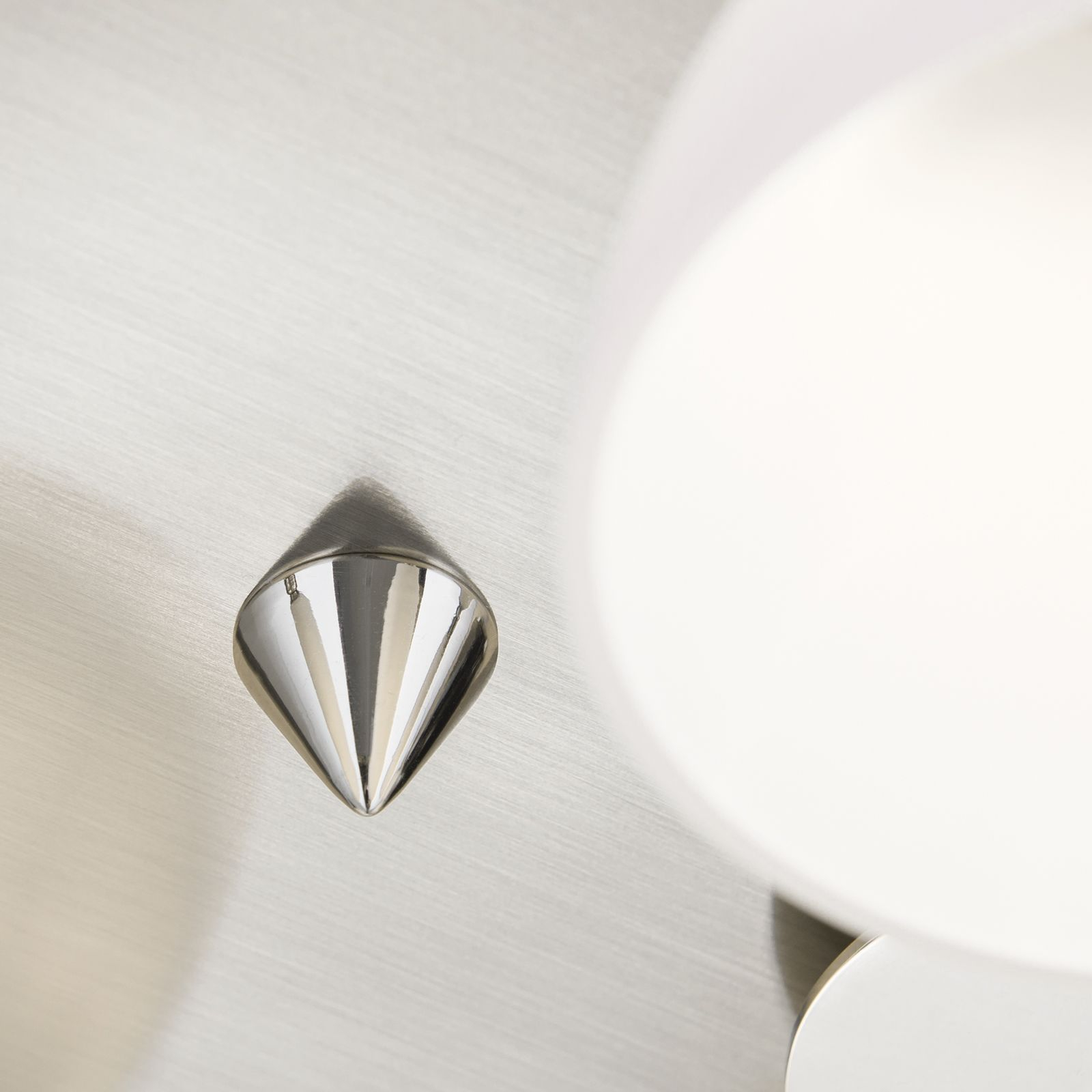 За стила и естетиката на интериора в изключително висока степен допринасят, както цялостната визия и дизайн на осветителното тяло, така и вложените в изработката висококачествени материали, като масивен месинг с покритие от сатениран хром, стъкло в цвят бял сатен.