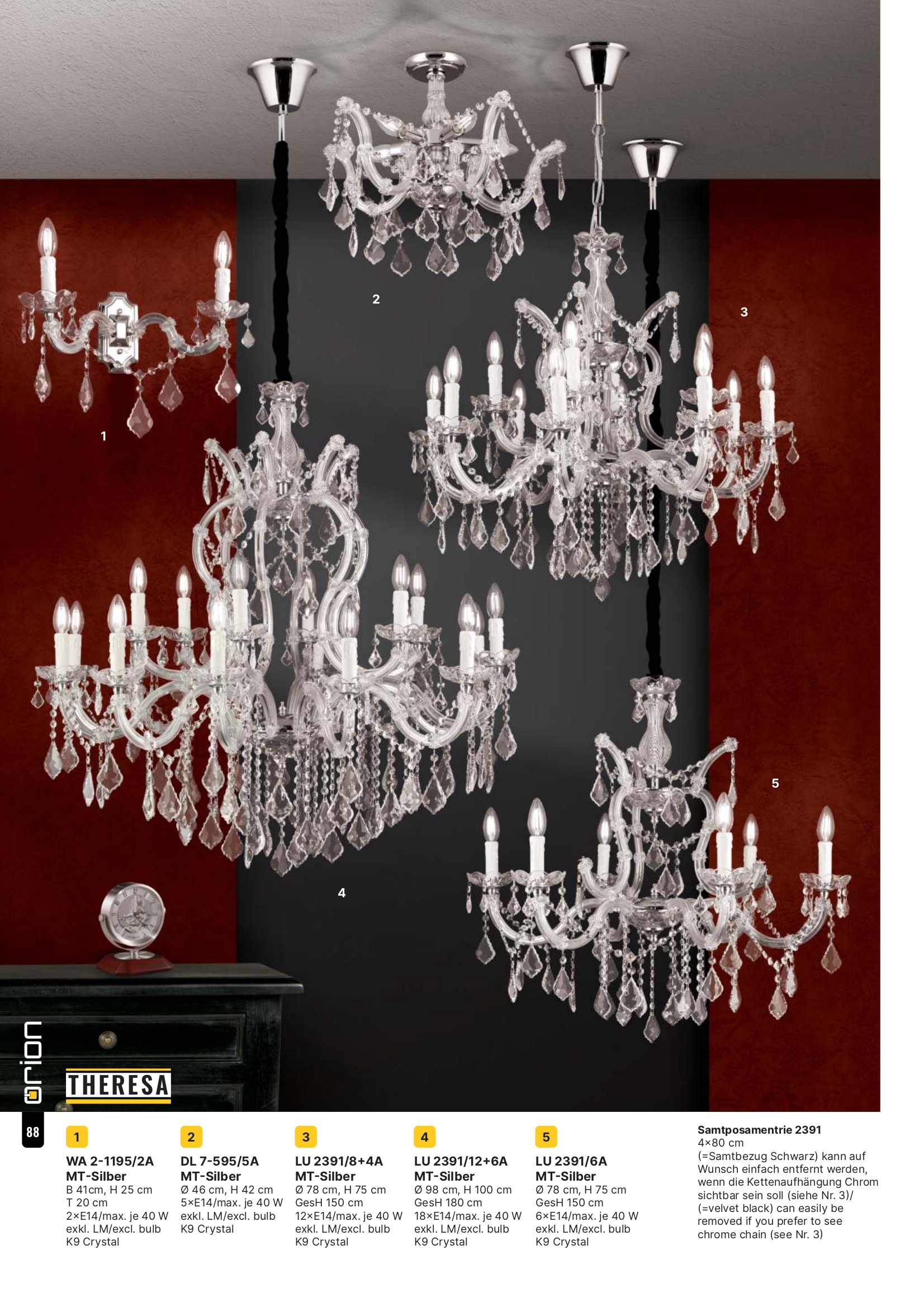 Осветителното тяло DL 7-595/5 MT-silber (5xE14) ще осигури комфорт и естетика във всяко помещение, в което се постави. Цялостната визия и дизайн на лампата и вложените в изработката й материали, като стомана в цвят сребро, кристали К9, ще допринесат за един неповторим стил. Благодарение на дългогодишния опит, качествените материали и строгия контрол на качеството на изработка на производителя Orion (Австрия), DL 7-595/5 MT-silber (5xE14) е на високо европейско ниво.