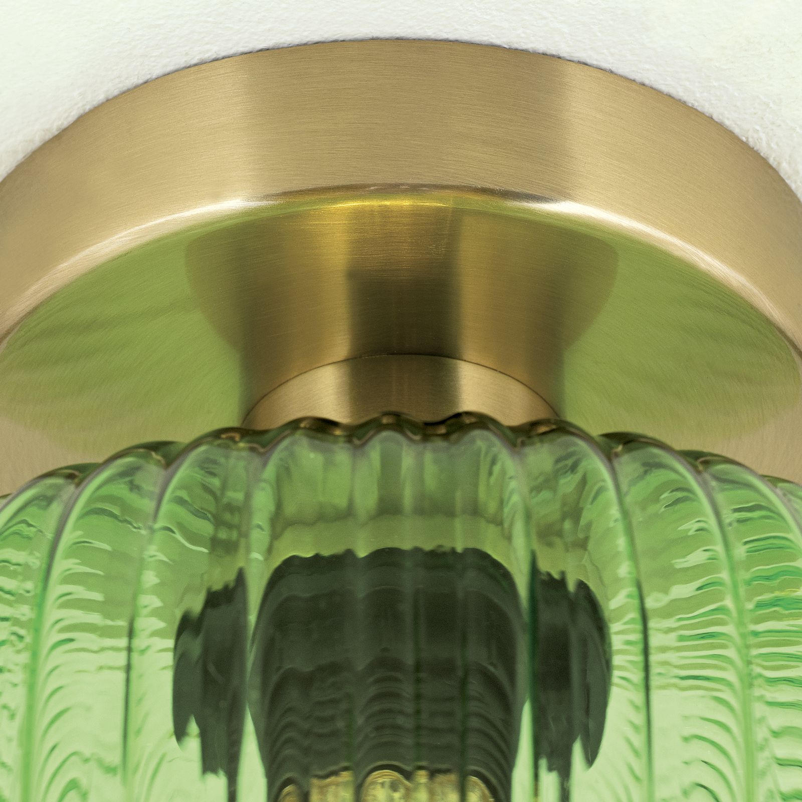 За стила и естетиката на интериора в изключително висока степен допринасят, както цялостната визия и дизайн на осветителното тяло, така и вложените в изработката висококачествени материали, като метал в цвят античен месинг, стъкло в зелен цвят.