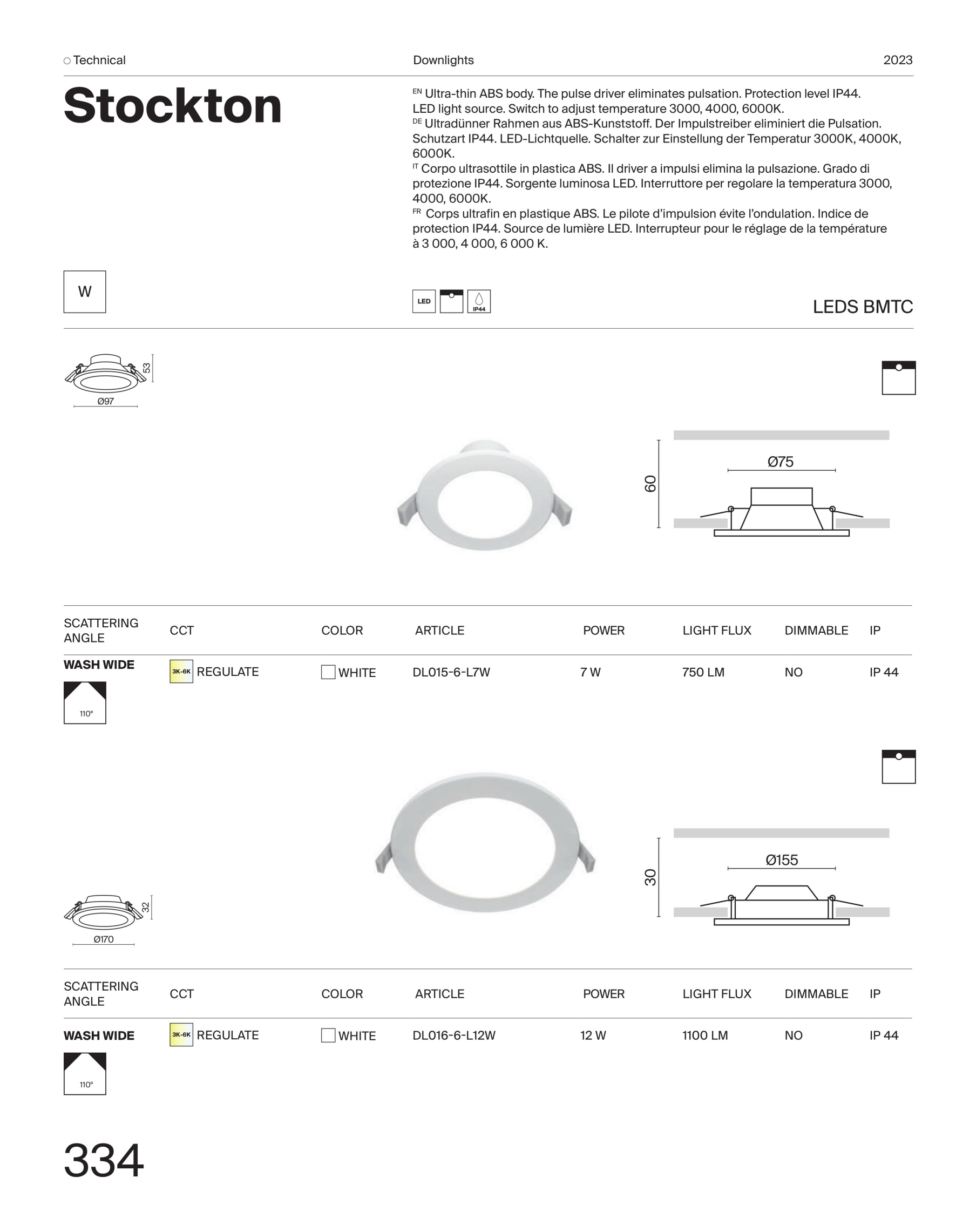 тяло от полимер (ABS), чрез превключвател може да се променя цветната температура 3000К, 4000К, 6000К, ъгъл на разпръскване на светлината 110°