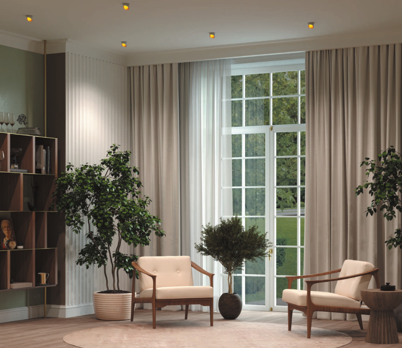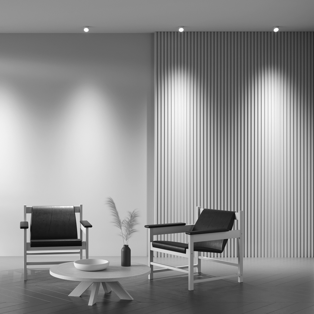 За стила, хармонията и естетиката на обстановката допринасят, както цялостната визия и дизайн на осветителното тяло, така и вложените в изработката качествени материали, като: метален корпус със наклонен срез в бяло отвън и златисто отвътре, дълбоко разположеният източник на светлина предпазва от отблясъци.