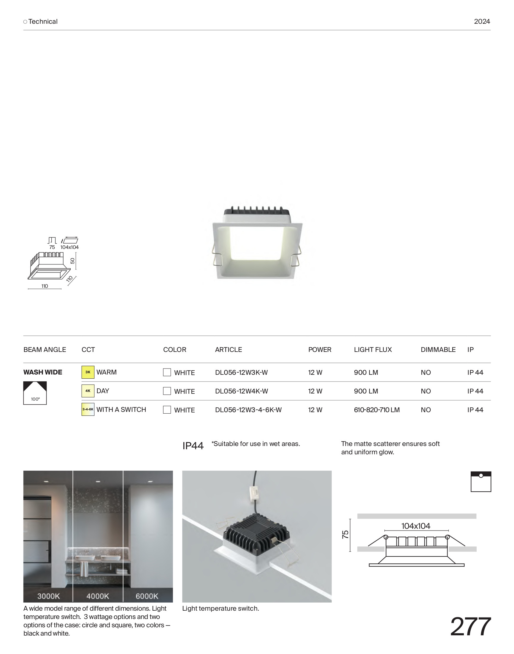 алуминий и полимер в бял цвят, ъгъл на разсейване на светлината 100°, възможност за регулиране на цветната температура с превключвател 3000К/4000К/6000К