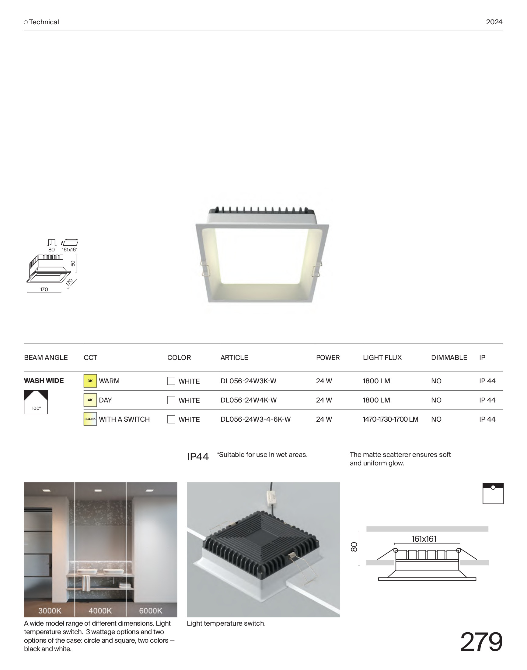 алуминий и полимер в бял цвят, ъгъл на разсейване на светлината 100°, възможност за регулиране на цветната температура с превключвател 3000К/4000К/6000К