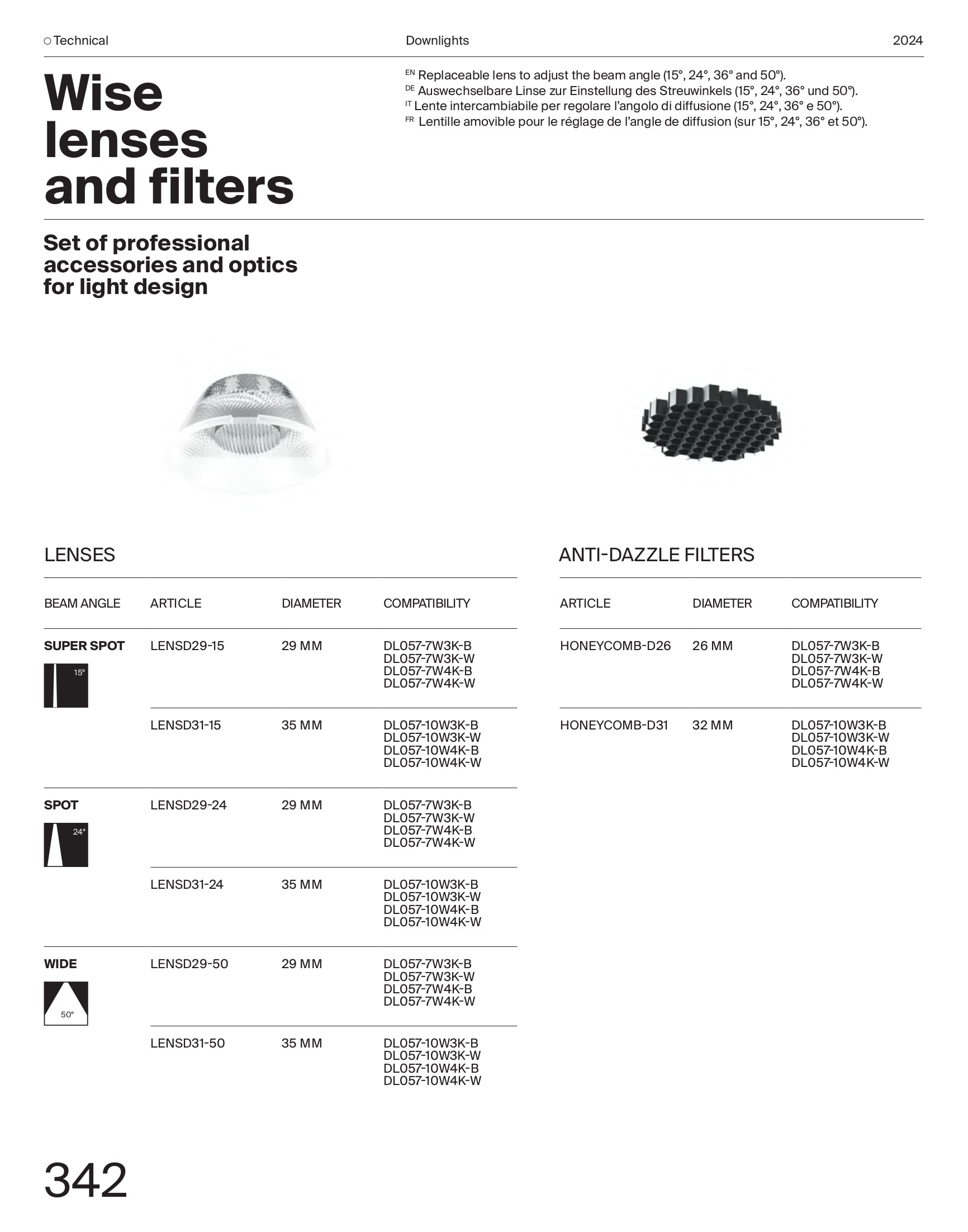 алуминий в черен цвят, полимер в черно, възможност за промяна на ъгъла на осветяване до 25⁰, може допълнително да се закупят сменяеми рефлектори и лещи от матово злато за регулиране на разпръскването на лъча в диапазона 15°-50°