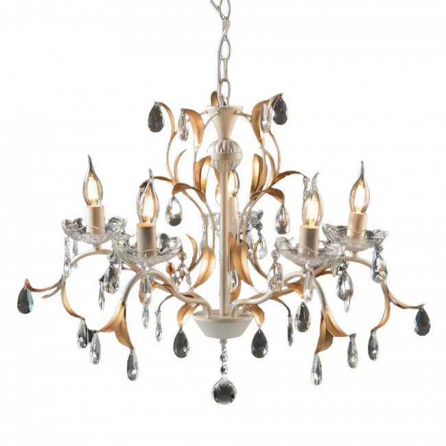 метал в бяло със златна патина, орнаменти в цвят антично злато, прозрачен кристал, бял PVC кабел