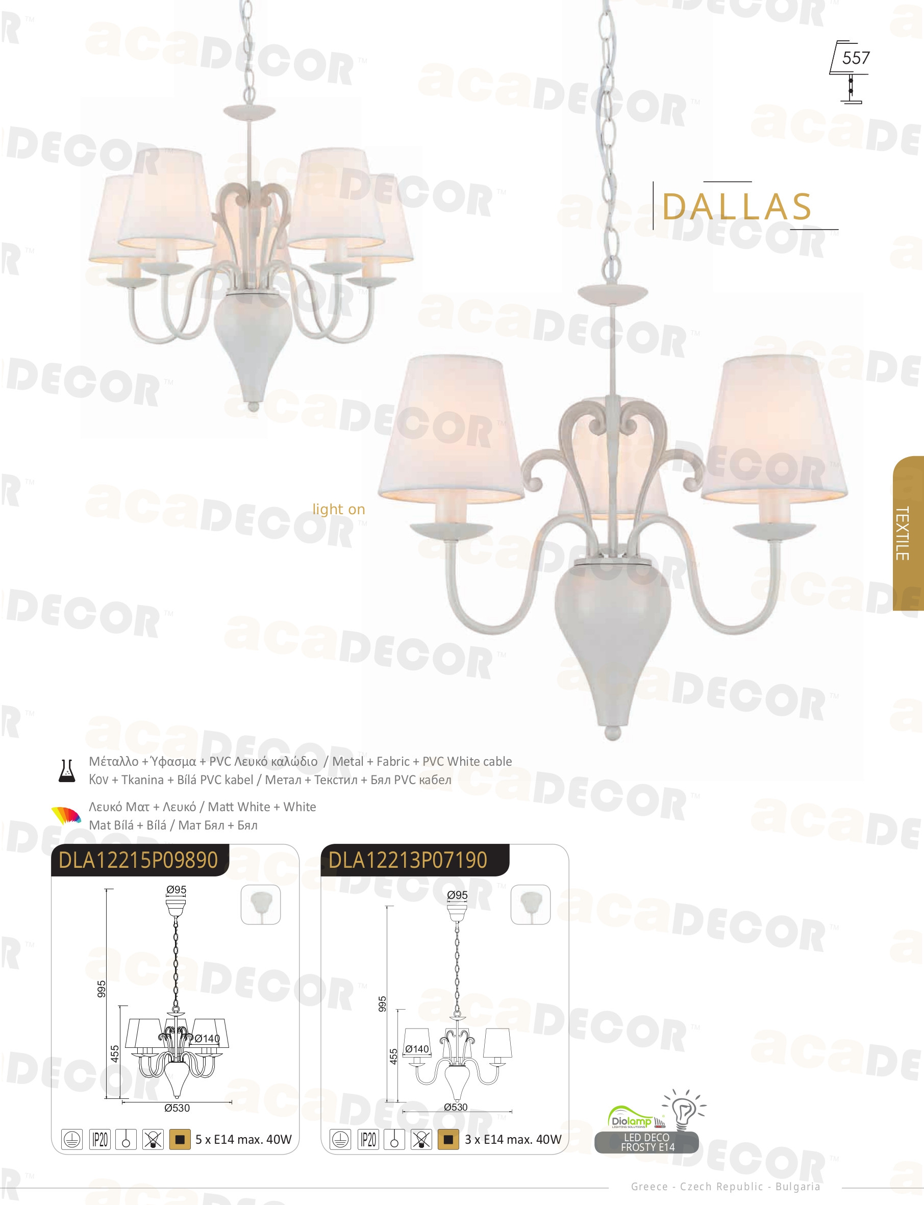Осветителното тяло DLA12213P ще осигури комфорт и естетика във всяко помещение, в което се постави. Цялостната визия и дизайн на лампата и вложените в изработката й материали, като метал в цвят бял мат, текстил в бял цвят, бял PVC кабел, ще допринесат за един неповторим стил. Благодарение на дългогодишния опит, качествените материали и строгия контрол на качеството на изработка на производителя ACA-Lighting (Гърция), DLA12213P е на високо европейско ниво.