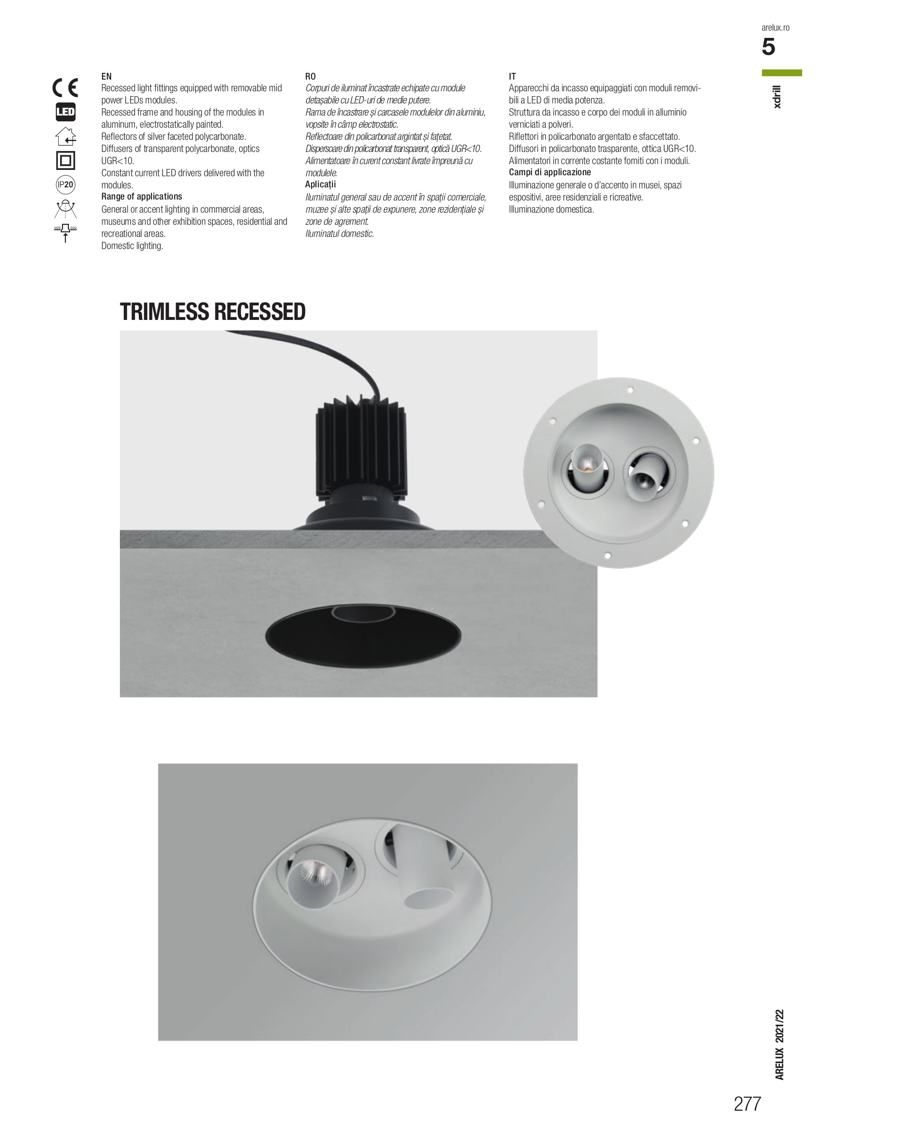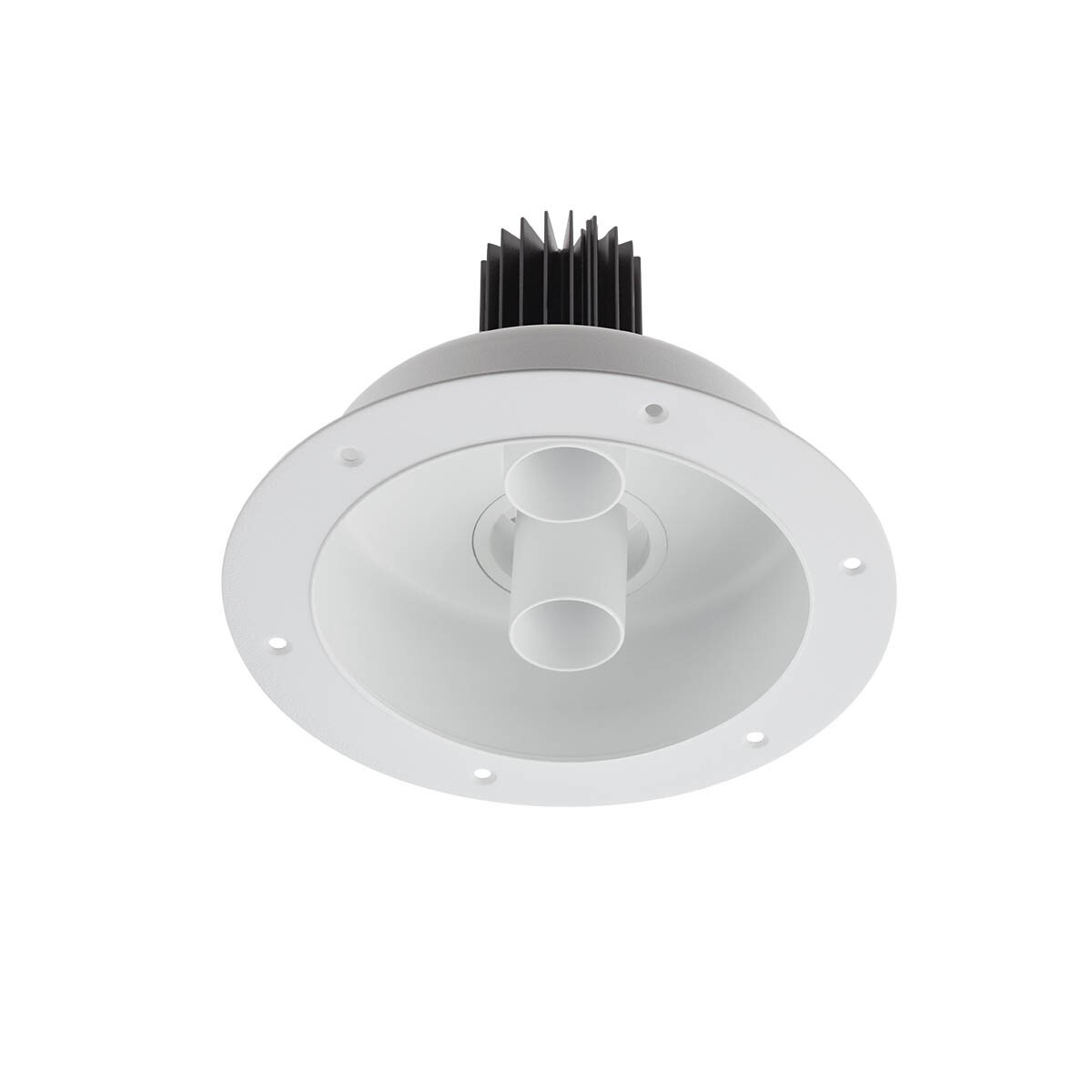 алуминий в бял матов цвят, рефлектор от поликарбонат със сребро, разсейвателят е от прозрачен поликарбонат със стойност UGR<10, рефлекторът може да се върти на 355° и да се накланя на страни под ъгъл от 65°, декоративен ринг от алуминий в бяло