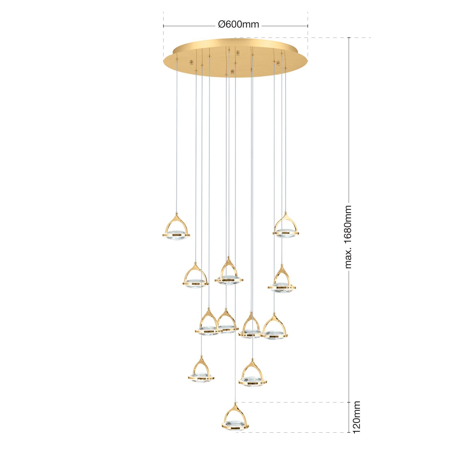 Осветителното тяло DLU 1738/12 gold (LED82,5W/3600lm/3000K) представлява лед полилей в съвременен, дизайнерски стил. DLU 1738/12 gold (LED82,5W/3600lm/3000K) е от категорията и е подходящо за осветяване на различни помещения и пространства като: всекидневна / хол, спалня, кухня, трапезария, офис.