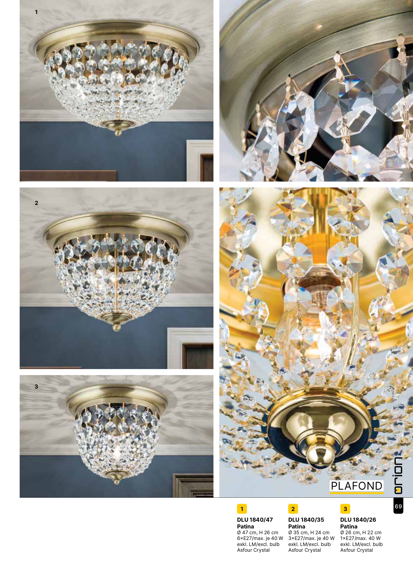Осветителното тяло DLU 1840/47 Patina (6xE27) ще осигури комфорт и естетика във всяко помещение, в което се постави. Цялостната визия и дизайн на лампата и вложените в изработката й материали, като кристали ASFOUR, метал в цвят патина, ще допринесат за един неповторим стил. Благодарение на дългогодишния опит, качествените материали и строгия контрол на качеството на изработка на производителя Orion (Австрия), DLU 1840/47 Patina (6xE27) е на високо европейско ниво.