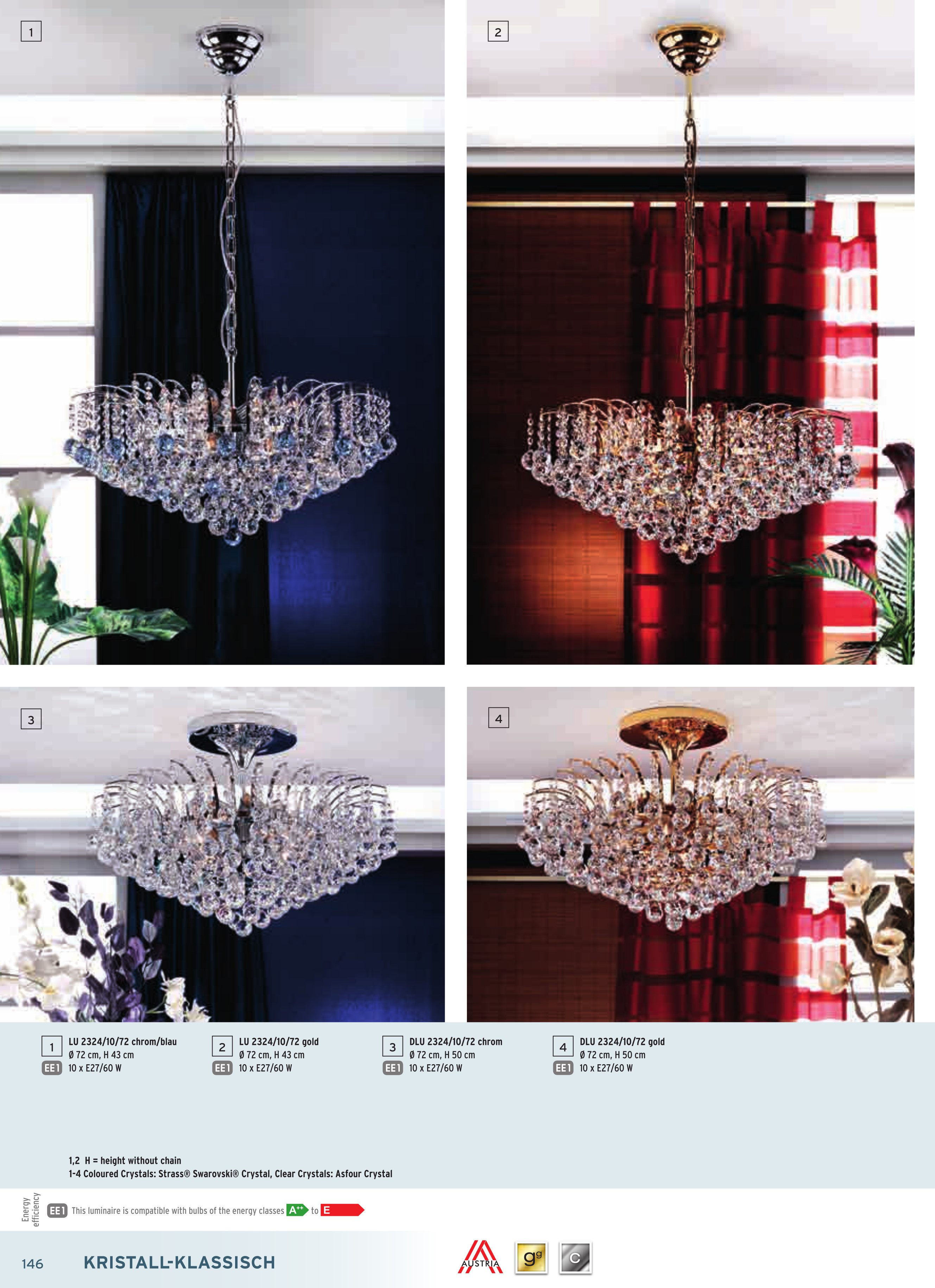 Осветителното тяло DLU 2324/10/72 gold (10xE27) ще осигури комфорт и естетика във всяко помещение, в което се постави. Цялостната визия и дизайн на лампата и вложените в изработката й материали, като позлатен с 24 карата злато масивен месинг, многобройни фасетирани кристални топки Asfour Crystal, прикрепени към филигранни дъги, осмоъгълни кристални елементи, ще допринесат за един неповторим стил. Благодарение на дългогодишния опит, качествените материали и строгия контрол на качеството на изработка на производителя Orion (Австрия), DLU 2324/10/72 gold (10xE27) е на високо европейско ниво.