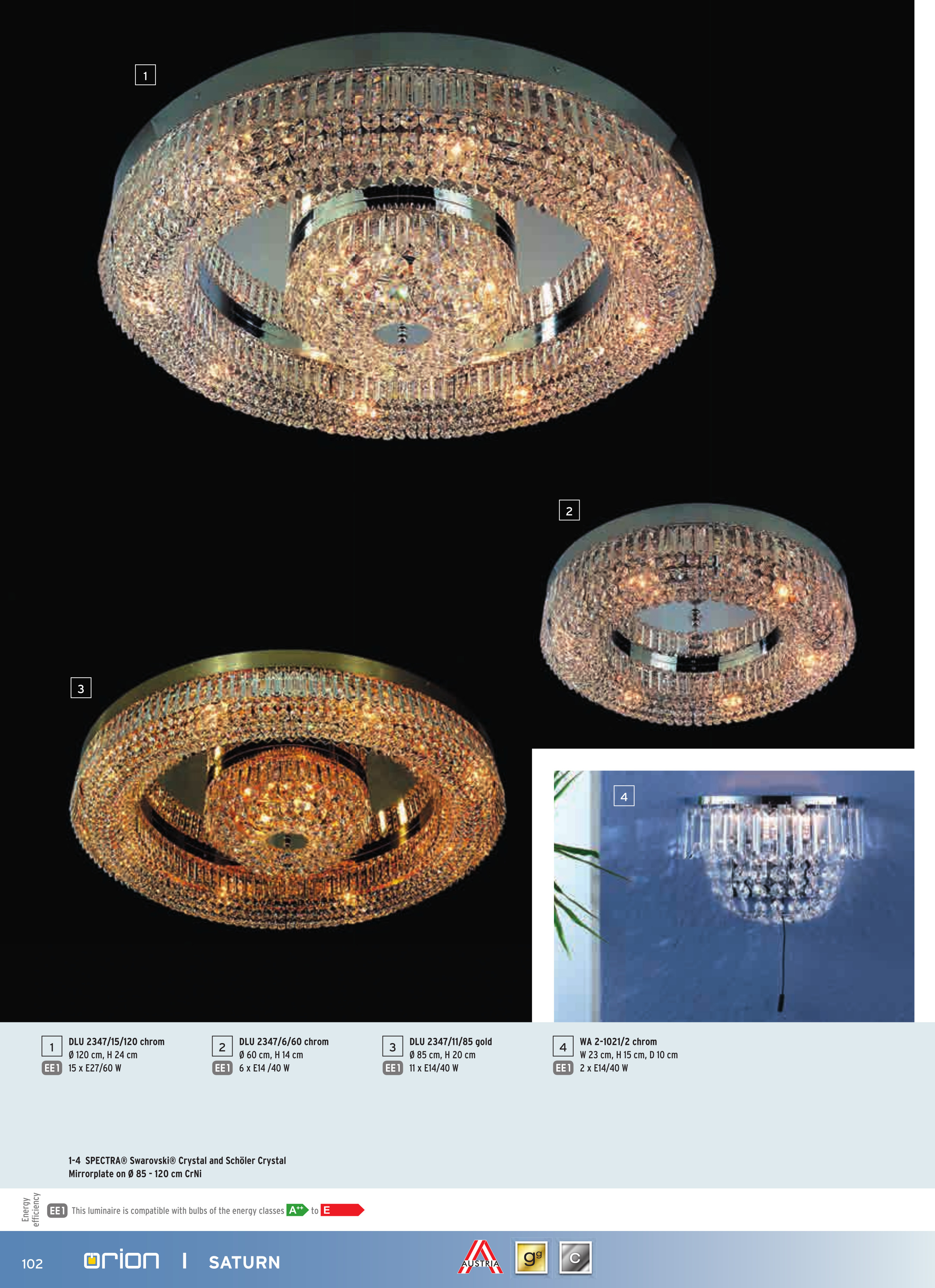 Осветителното тяло DLU 2347/6/60 gold (6xE14) ще осигури комфорт и естетика във всяко помещение, в което се постави. Цялостната визия и дизайн на лампата и вложените в изработката й материали, като месингова плоча позлатена с 24 карата злато, множество кристали SPECTRA® Swarovski® Crystal & SCHÖLER CRYSTAL®, ще допринесат за един неповторим стил. Благодарение на дългогодишния опит, качествените материали и строгия контрол на качеството на изработка на производителя Orion (Австрия), DLU 2347/6/60 gold (6xE14) е на високо европейско ниво.