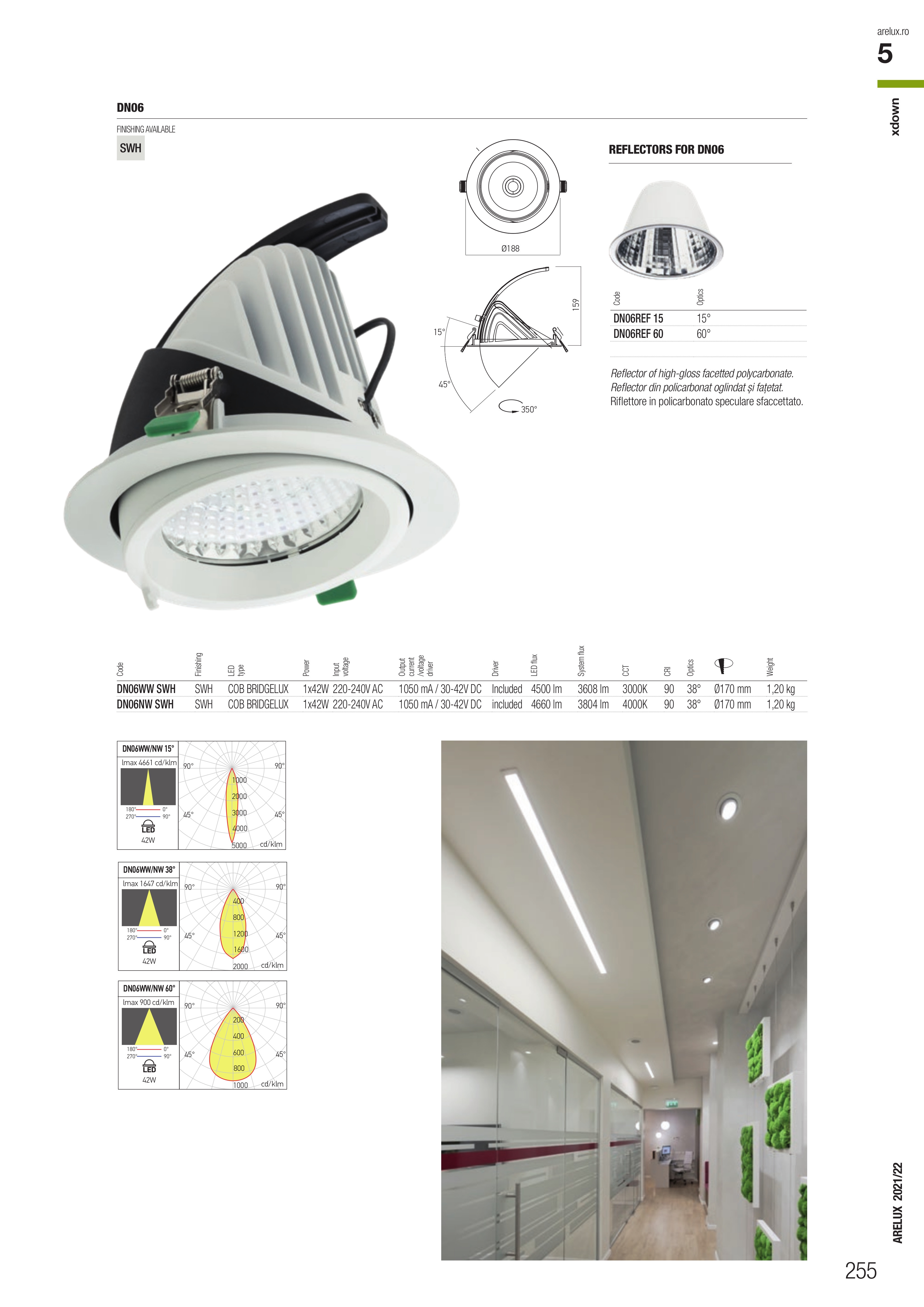 Лед луничка / луна, спот лампа DN06WW SWH ще осигури комфорт и естетика във всяко помещение, в което се постави. Цялостната визия и дизайн на led лампата и вложените в изработката й материали, като лят под налягане алуминий в бяло, система за регулиране на позицията от стоманена ламарина в бяло, която позволява въртене на 350° около вертикалната ос и 60° около хоризонталната ос, рефлектор от фасетиран гланциран полимер, дифузьор от поликарбонат, ще допринесат за един неповторим стил. Благодарение на дългогодишния опит в производството на лед осветление, качествените материали и строгия контрол на качеството на изработка на дизайнерската линия Redo Arelux на производителя Redo (Румъния), DN06WW SWH е на високо европейско ниво.