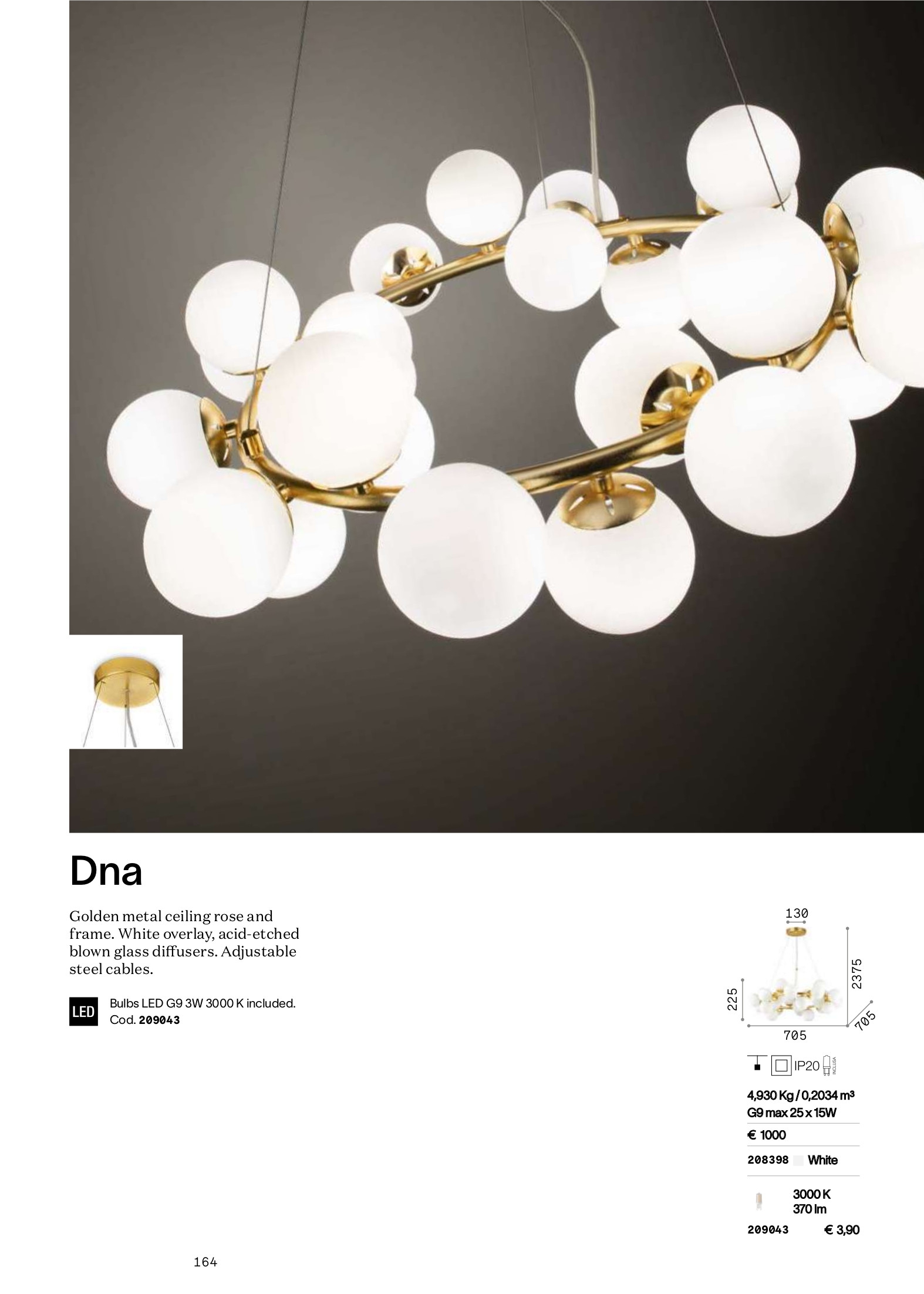 Осветителното тяло DNA SP25 ще осигури комфорт и естетика във всяко помещение, в което се постави. Цялостната визия и дизайн на лампата и вложените в изработката й материали, като златна метална таванна розeтка и рама, разсейватели от издухано стъкло с киселинно гравиране и бяло покритие, регулируеми стоманени кабели, ще допринесат за един неповторим стил. Благодарение на дългогодишния опит, качествените материали и строгия контрол на качеството на изработка на производителя Ideal-Lux (Италия), DNA SP25 е на високо европейско ниво.