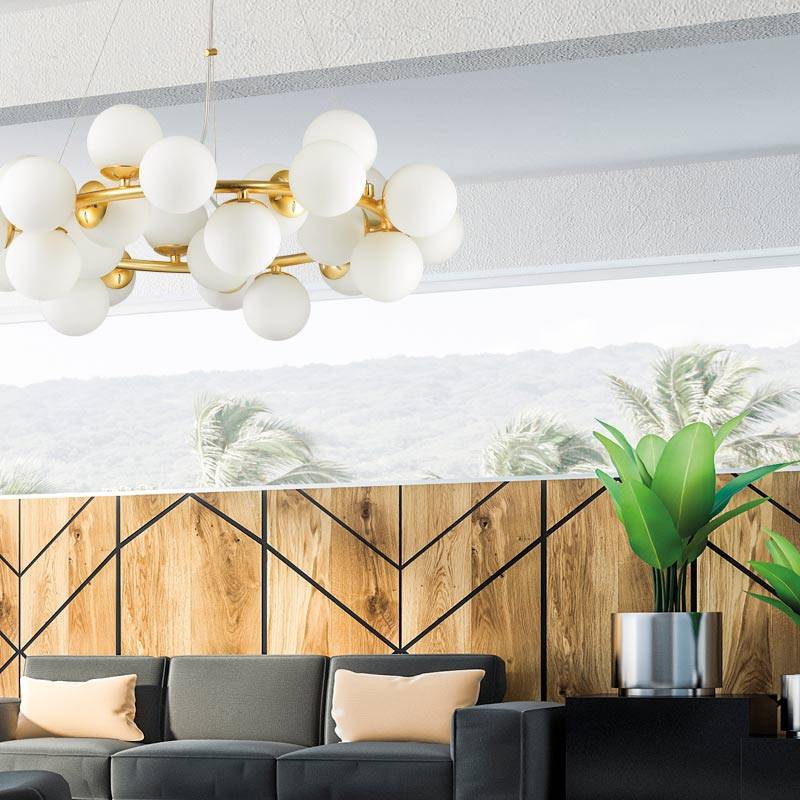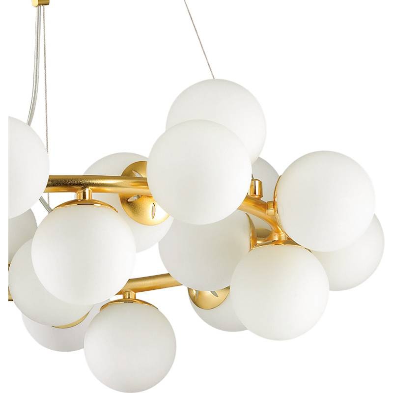 златна метална таванна розeтка и рама, разсейватели от издухано стъкло с киселинно гравиране и бяло покритие, регулируеми стоманени кабели