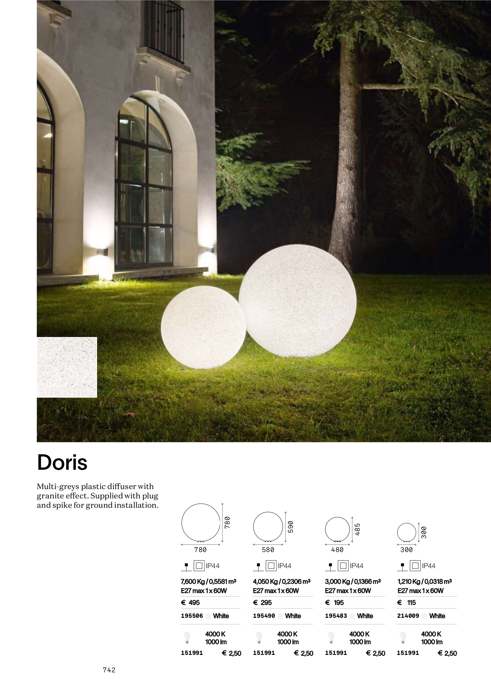 Осветителното тяло DORIS PT1 D78 ще осигури комфорт и естетика във всяко помещение, в което се постави. Цялостната визия и дизайн на лампата и вложените в изработката й материали, като зърнисто бяло полимерно тяло с гранит ефект - дифузьор, захранващ кабел, ключ ON/OFF и шип за монтаж в земята, ще допринесат за един неповторим стил. Благодарение на дългогодишния опит, качествените материали и строгия контрол на качеството на изработка на производителя Ideal-Lux (Италия), DORIS PT1 D78 е на високо европейско ниво.