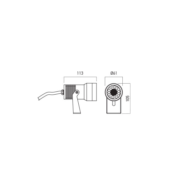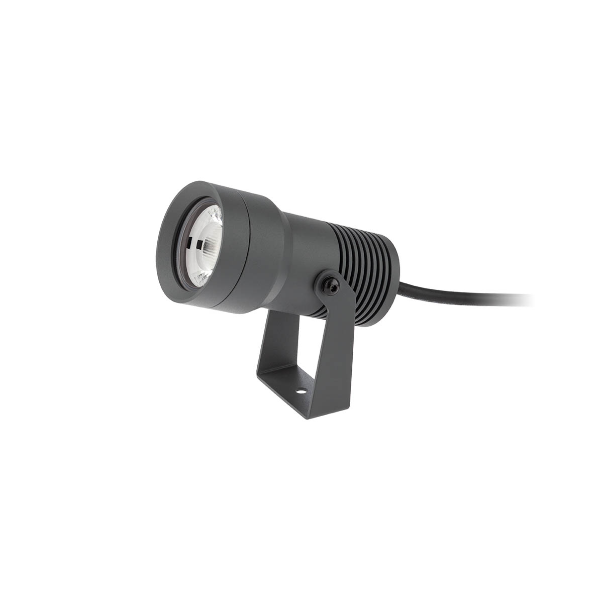насочващо се тяло и монтажна планка от лят алуминий в тъмно сив цвят, дисперсионна леща от поликарбонат с ъгъл 10°, захранващ кабел покрит с гума, 3x0.75 mm² с дължина 1m, PVC земен шип