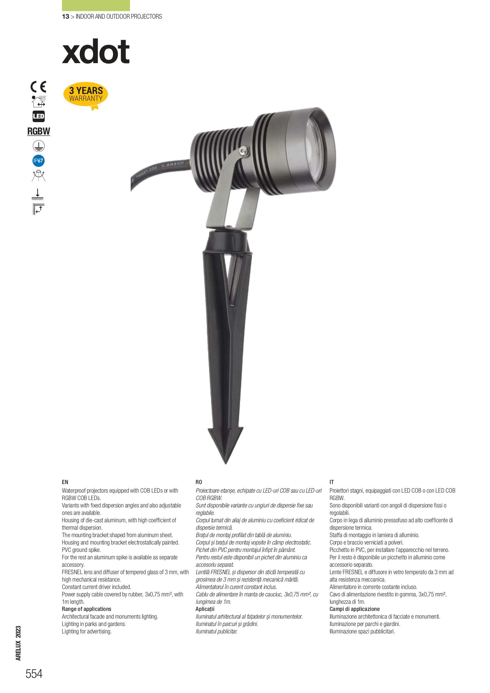 Лед външна лампа DT05WW10 ще осигури комфорт и естетика във всяко помещение, в което се постави. Цялостната визия и дизайн на led лампата и вложените в изработката й материали, като насочващо се тяло и монтажна планка от лят алуминий в тъмно сив цвят, дисперсионна леща от поликарбонат с ъгъл 10°, захранващ кабел покрит с гума, 3x0.75 mm² с дължина 1m, PVC земен шип, ще допринесат за един неповторим стил. Благодарение на дългогодишния опит в производството на лед осветление, качествените материали и строгия контрол на качеството на изработка на дизайнерската линия Redo Arelux на производителя Redo (Румъния), DT05WW10 е на високо европейско ниво.