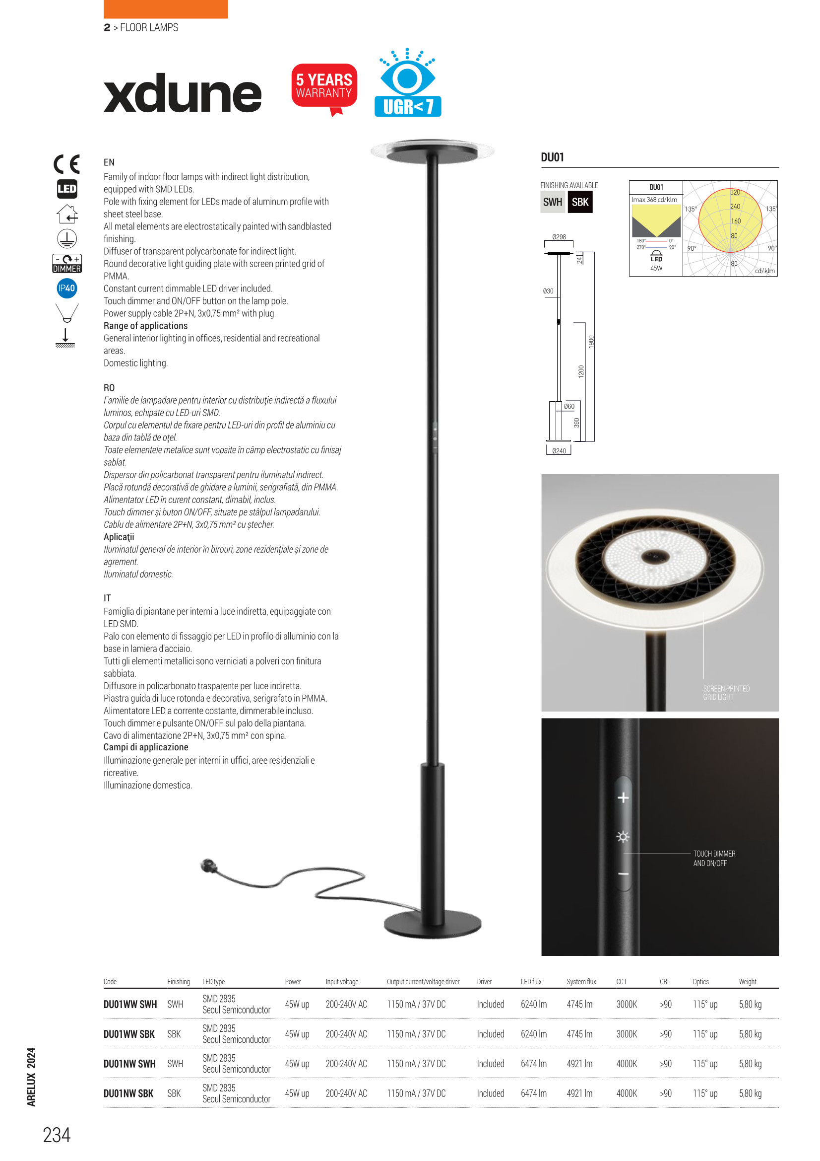 Осветителното тяло DU01NW SWH ще осигури комфорт и естетика във всяко помещение, в което се постави. Цялостната визия и дизайн на лампата и вложените в изработката й материали, като алуминиев профил, основа от стомана, всички метални елементи са с пясъкоструйно покритие, електростатично боядисани в бял цвят, разсейвател от прозрачен поликарбонат за индиректна светлина, кръгла светловодна плоча със ситопечатна мрежа от PММА, ще допринесат за един неповторим стил. Благодарение на дългогодишния опит, качествените материали и строгия контрол на качеството на изработка на дизайнерската линия Redo Arelux на производителя Redo (Румъния), DU01NW SWH е на високо европейско ниво.
