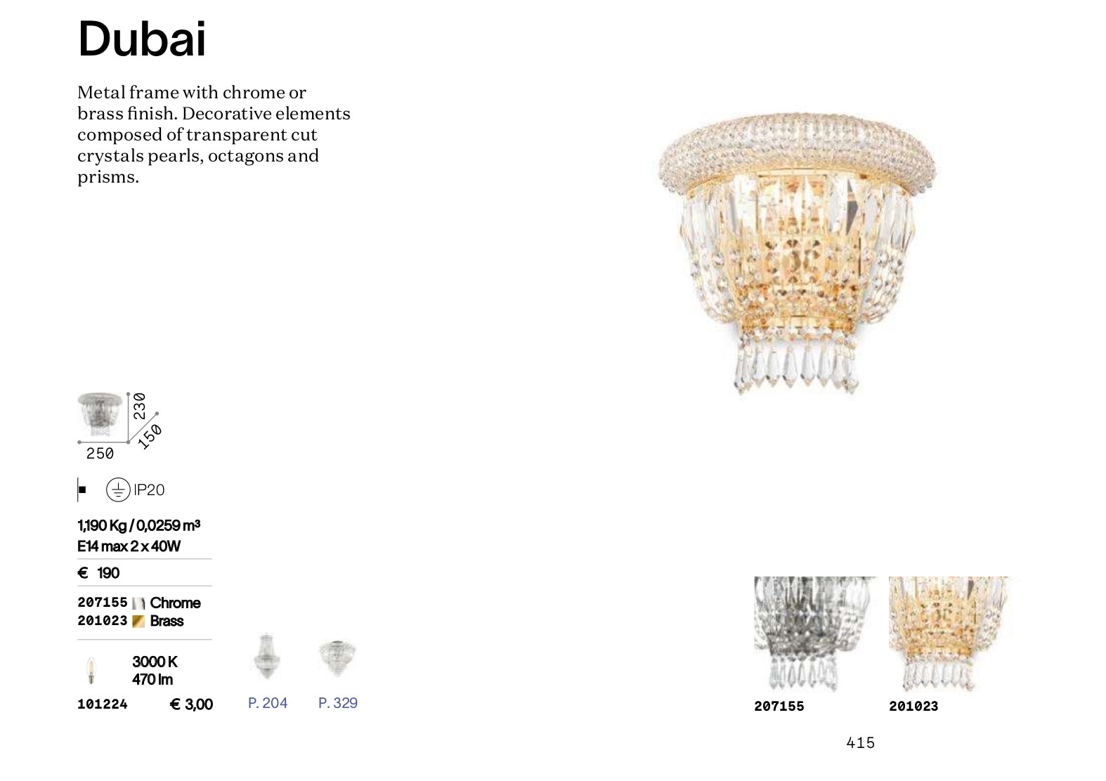 Осветителното тяло DUBAI AP2 CROMO ще осигури комфорт и естетика във всяко помещение, в което се постави. Цялостната визия и дизайн на лампата и вложените в изработката й материали, като метал в цвят хром, фасетирани кристални елементи с кръгла, осмоъгълна и призматична форма, ще допринесат за един неповторим стил. Благодарение на дългогодишния опит, качествените материали и строгия контрол на качеството на изработка на производителя Ideal-Lux (Италия), DUBAI AP2 CROMO е на високо европейско ниво.