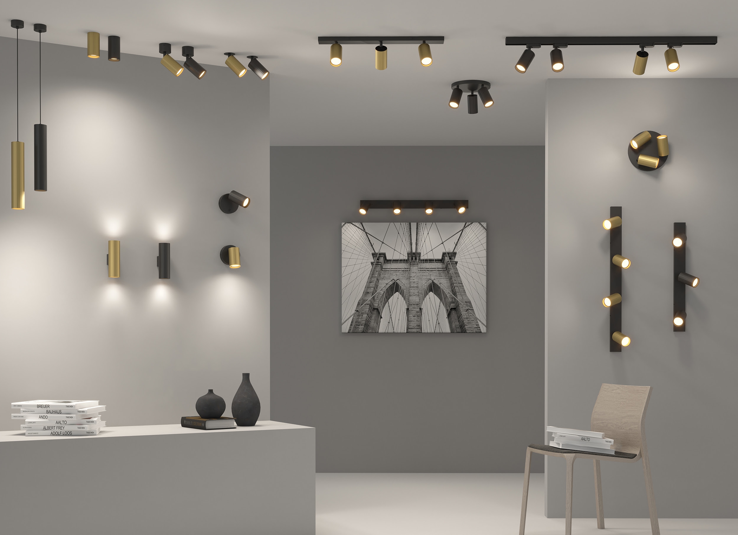 алумениева основа в черен цвят, подвижно алуминиево осветително тяло в цвят техническо злато, ъгъл на завъртане 360° и ъгъл на светлинния лъч 90°