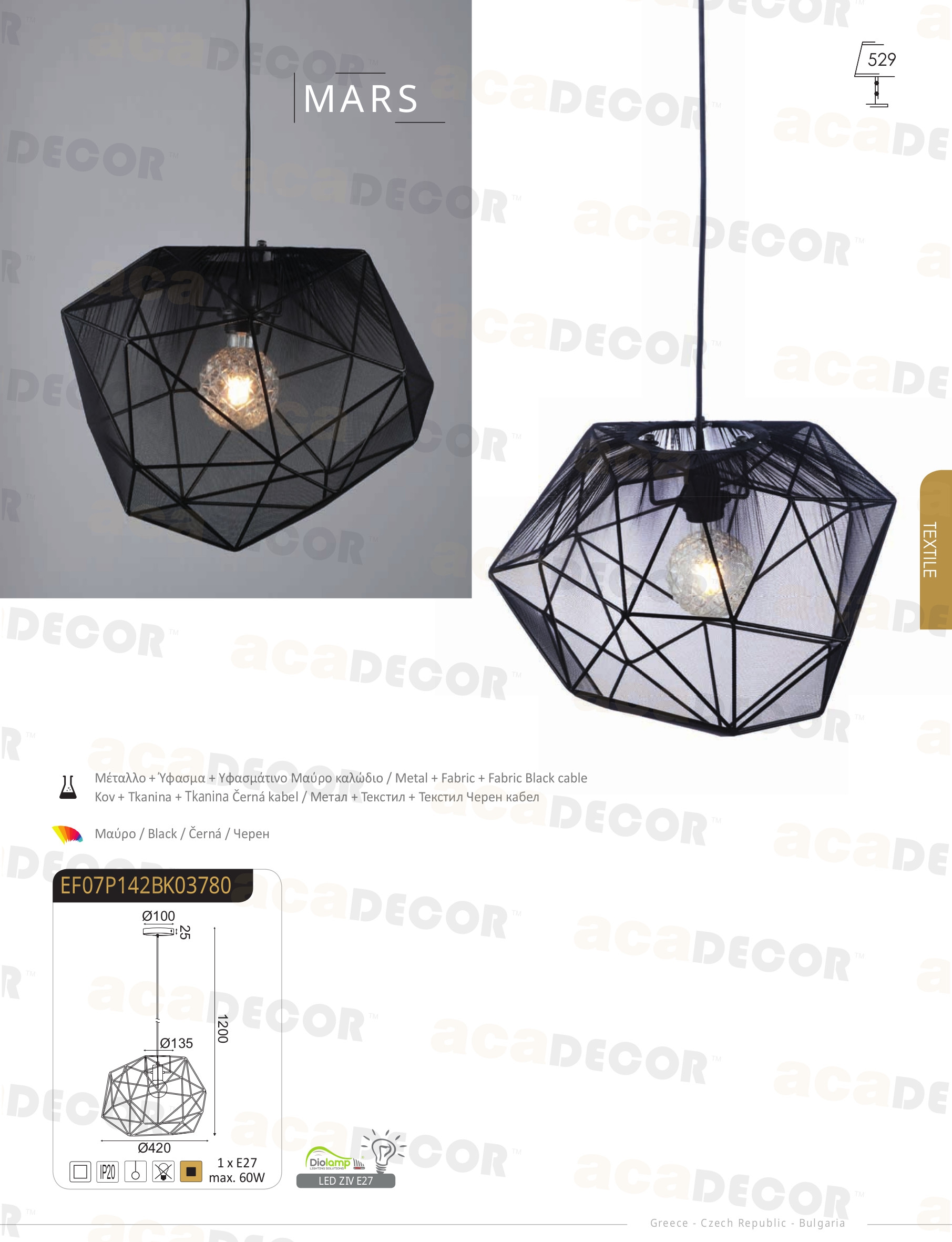 Осветителното тяло EF07P142BK ще осигури комфорт и естетика във всяко помещение, в което се постави. Цялостната визия и дизайн на лампата и вложените в изработката й материали, като метал в черен цвят, текстил в черно, кабел с черна текстилна оплетка, ще допринесат за един неповторим стил. Благодарение на дългогодишния опит, качествените материали и строгия контрол на качеството на изработка на производителя ACA-Lighting (Гърция), EF07P142BK е на високо европейско ниво.