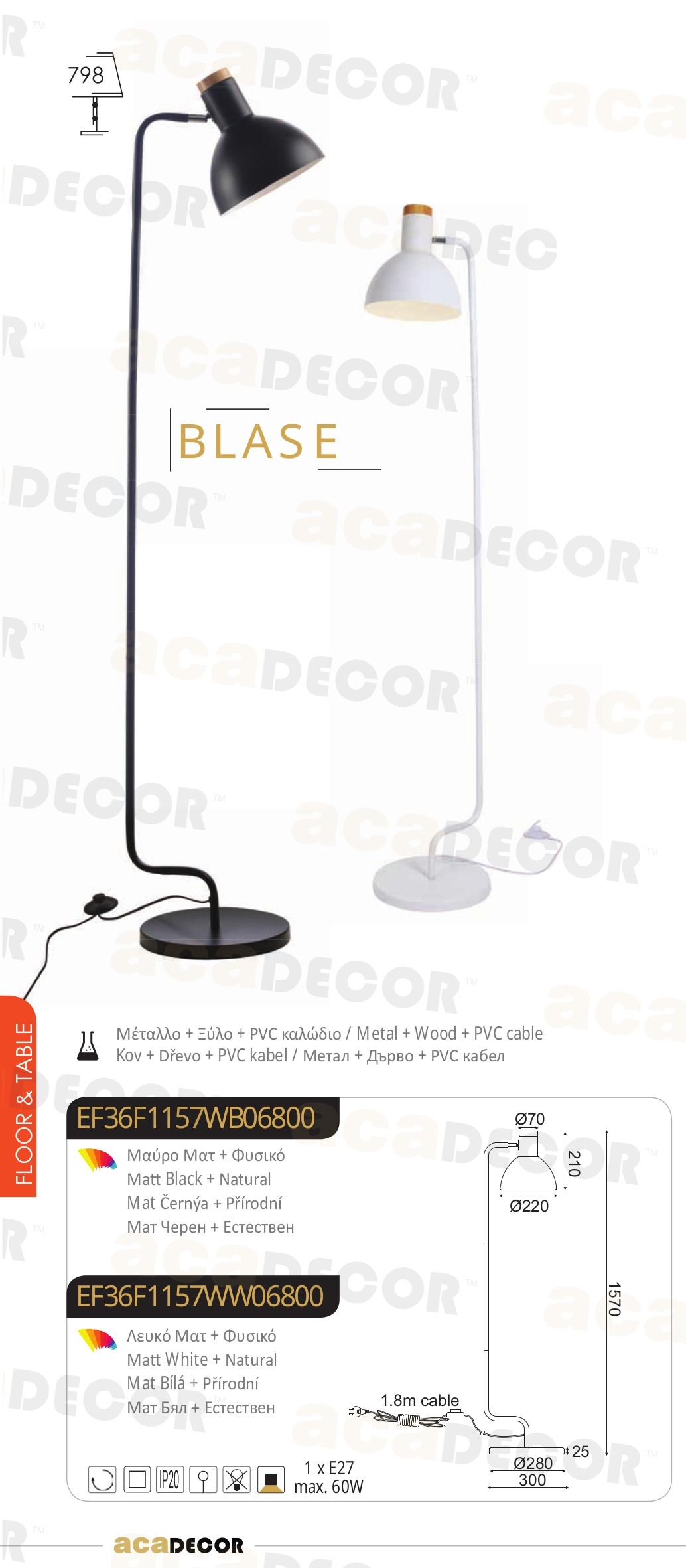 Осветителното тяло EF36F1157WB представлява лампион / правостояща лампа в съвременен стил. EF36F1157WB е от категорията осветителни тела и е подходящо за осветяване на различни помещения и пространства като: всекидневна / хол, спалня, трапезария, офис.