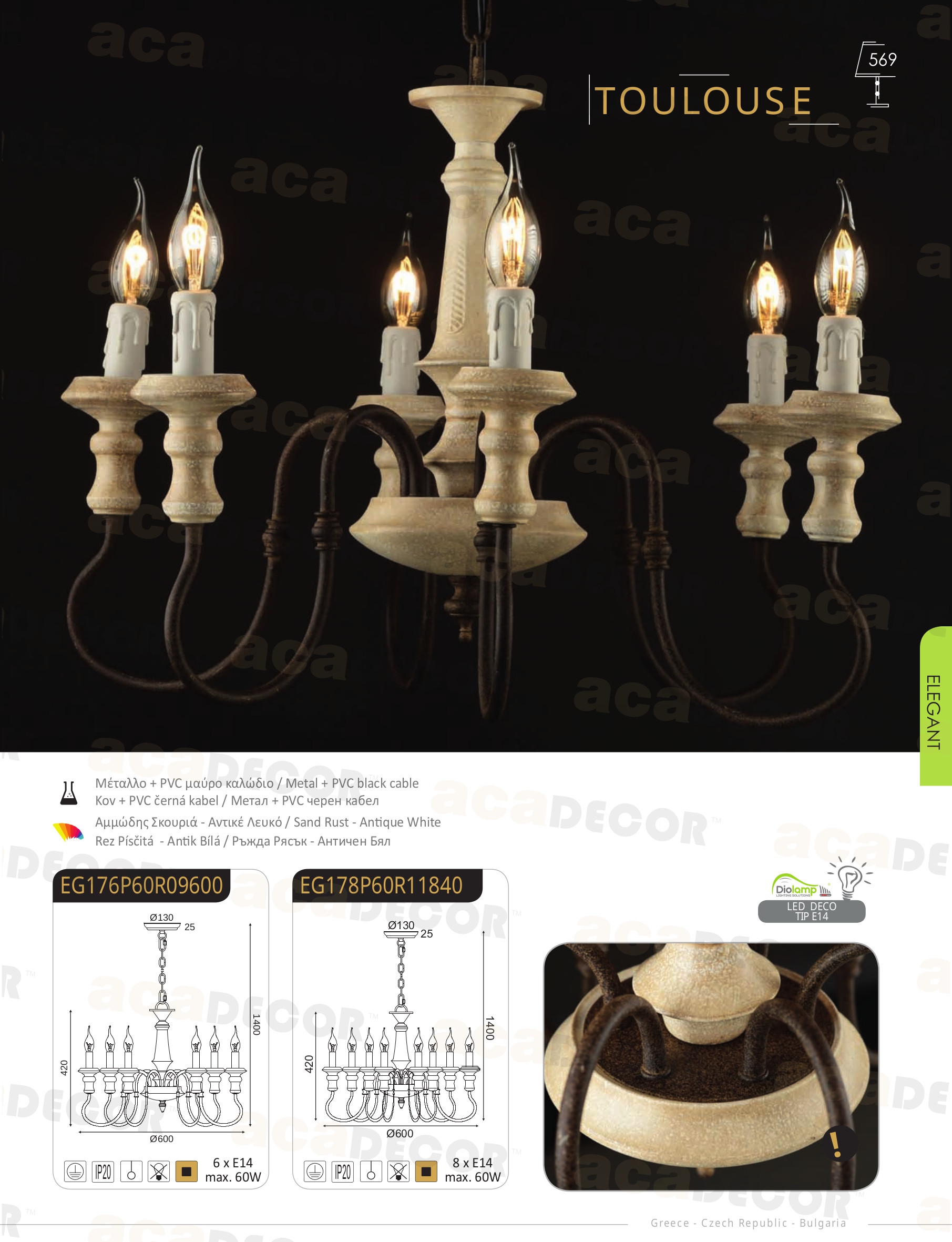 Осветителното тяло EG176P60R ще осигури комфорт и естетика във всяко помещение, в което се постави. Цялостната визия и дизайн на лампата и вложените в изработката й материали, като релефен метал в цвят ръжда, метал в цвят антично бяло, черен PVC кабел, ще допринесат за един неповторим стил. Благодарение на дългогодишния опит, качествените материали и строгия контрол на качеството на изработка на производителя ACA-Lighting (Гърция), EG176P60R е на високо европейско ниво.