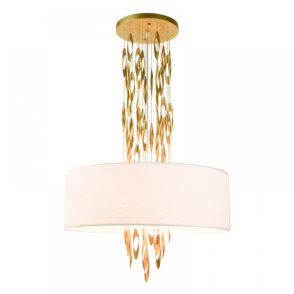 За стила и естетиката на интериора допринасят, както цялостната визия и дизайн на осветителното тяло, така и вложените от производителя в изработката висококачествени материали, като метал в цвят шампанско-злато, текстил в бяло.