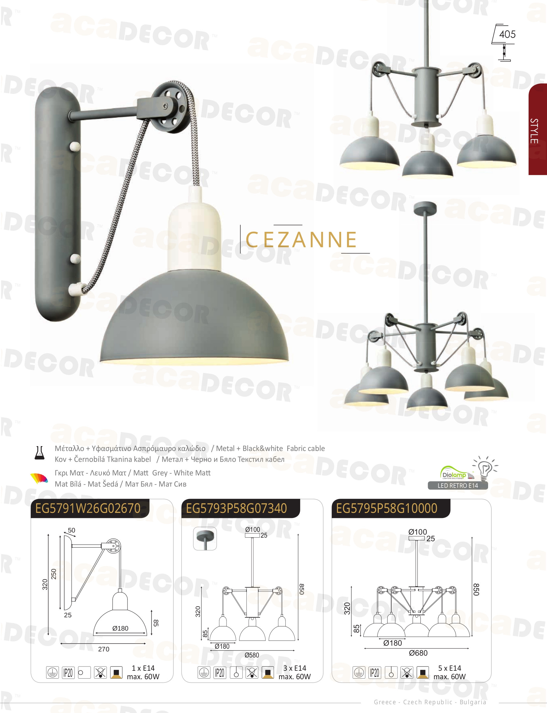 Осветителното тяло EG5795P58G ще осигури комфорт и естетика във всяко помещение, в което се постави. Цялостната визия и дизайн на лампата и вложените в изработката й материали, като метал в матово сиво отвън и матово бяло отвътре, кабел с черно-бяла текстилна оплетка, ще допринесат за един неповторим стил. Благодарение на дългогодишния опит, качествените материали и строгия контрол на качеството на изработка на производителя ACA-Lighting (Гърция), EG5795P58G е на високо европейско ниво.