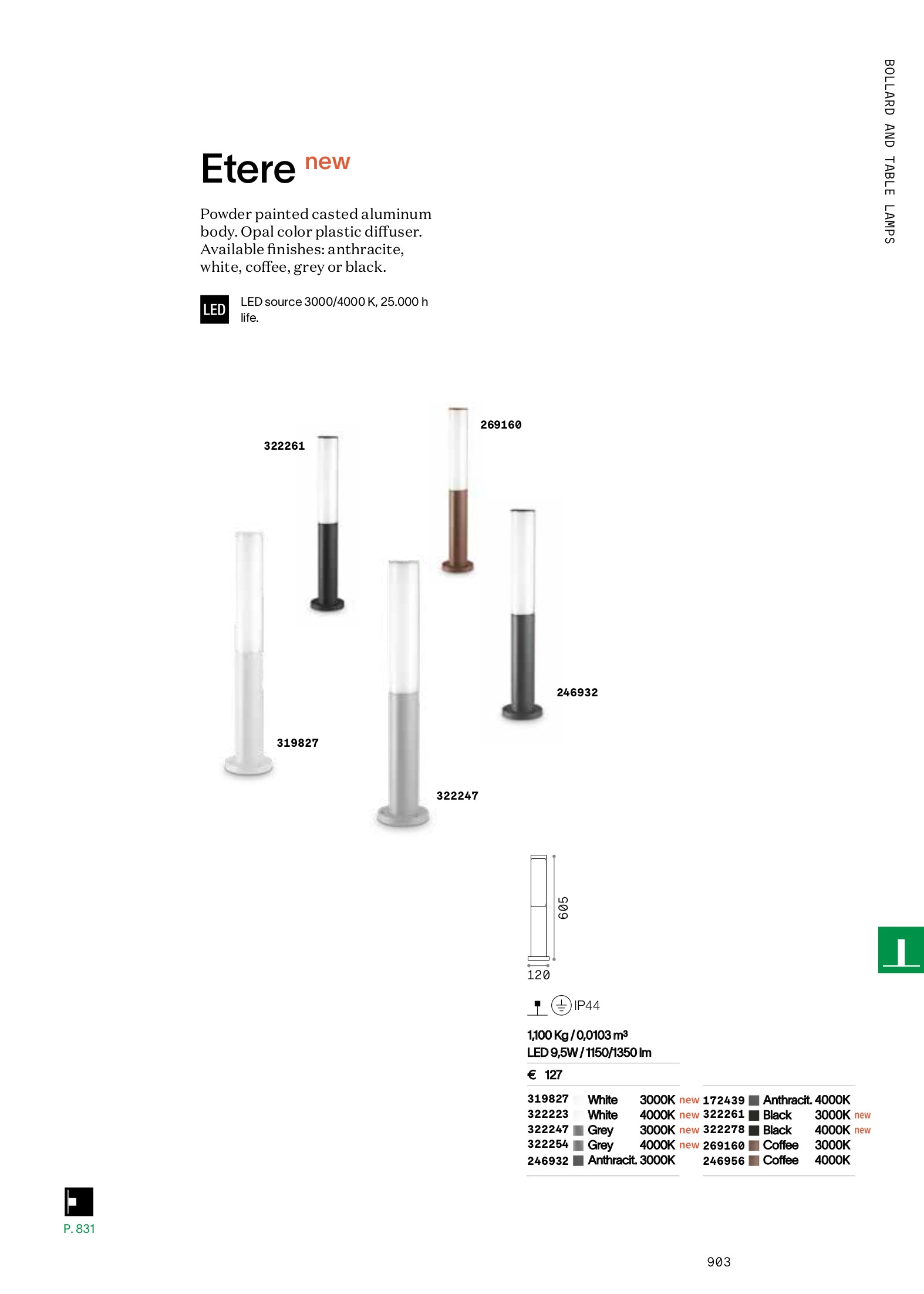 Осветителното тяло ETERE PT BIANCO 3000K представлява външна лампа в съвременен стил. ETERE PT BIANCO 3000K е от категорията осветителни тела и е подходящо за осветяване на различни помещения и пространства като: градинско осветление, външно осветление.