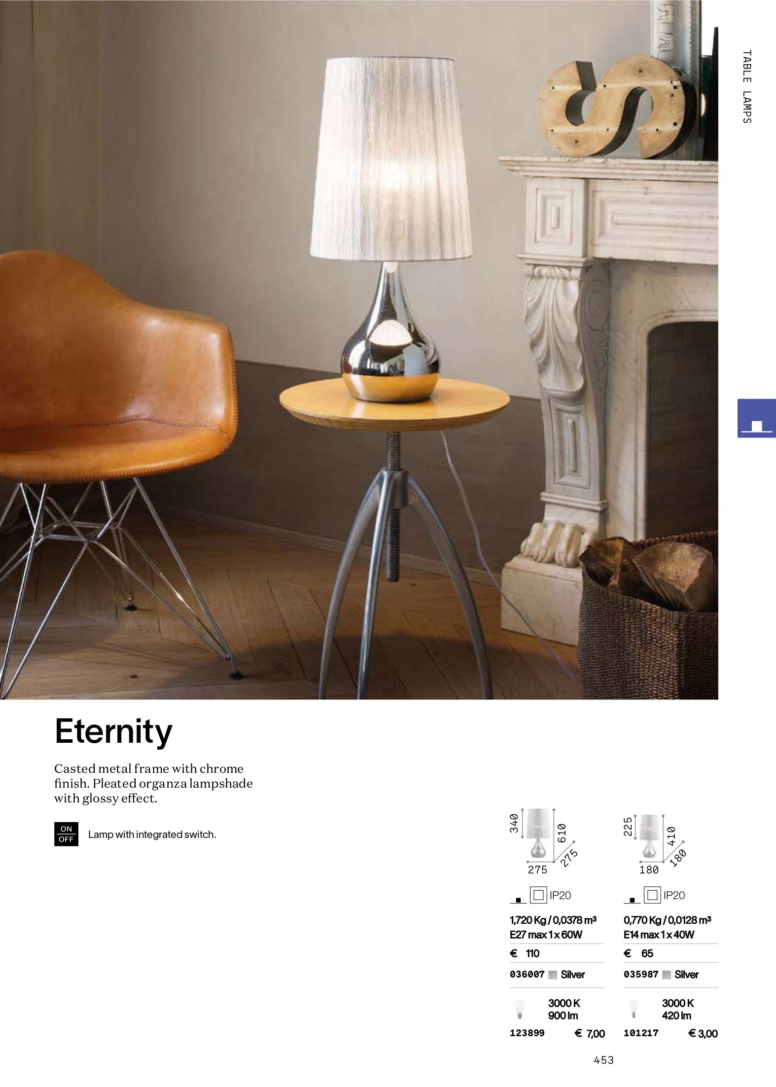 Осветителното тяло @ETERNITY TL1 SMALL ARGENTO ще осигури комфорт и естетика във всяко помещение, в което се постави. Цялостната визия и дизайн на лампата и вложените в изработката й материали, като лята метална рамка с хромирано покритие, плисиран абажур от органза с гланцов ефект, кабел с ключ и щепсел, ще допринесат за един неповторим стил. Благодарение на дългогодишния опит, качествените материали и строгия контрол на качеството на изработка на производителя Ideal-Lux (Италия), @ETERNITY TL1 SMALL ARGENTO е на високо европейско ниво.