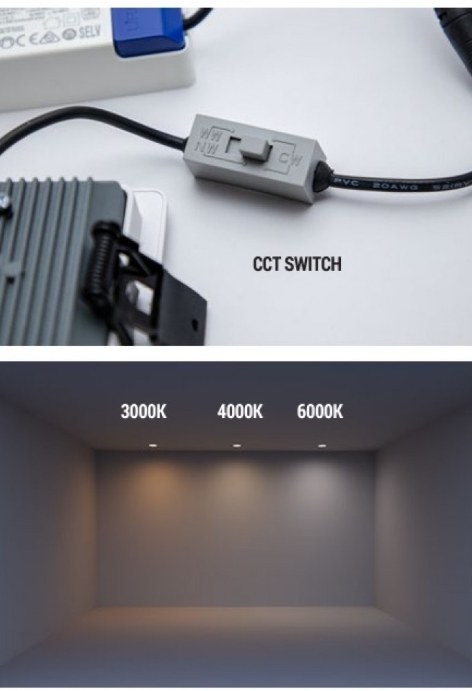 отлят под налягане алуминий с електростатично покритие в пясъчно черно, корпус от отлят под налягане анодизиран алуминий, служещ за радиатор за LED модулите, двоен дифузьор от полистирол - опал сатен и призматичен, превключвател за ССТ 3000/4000/6000K