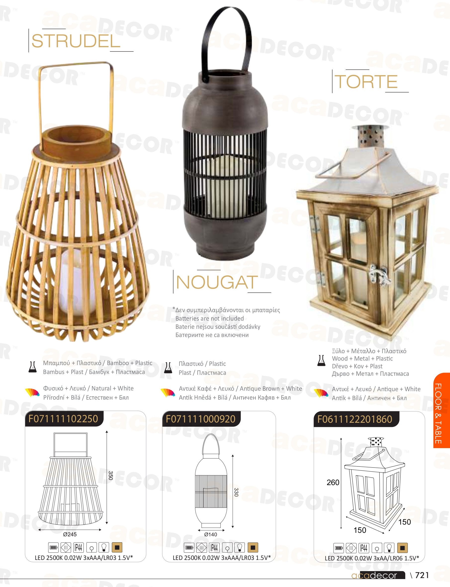 Осветителното тяло F06111222 ще осигури комфорт и естетика във всяко помещение, в което се постави. Цялостната визия и дизайн на лампата и вложените в изработката й материали, като дърво в цвят антик, метал, полимер в бяло, батерии 3 х AA не са включени, ще допринесат за един неповторим стил. Благодарение на дългогодишния опит, качествените материали и строгия контрол на качеството на изработка на производителя ACA-Lighting (Гърция), F06111222 е на високо европейско ниво.