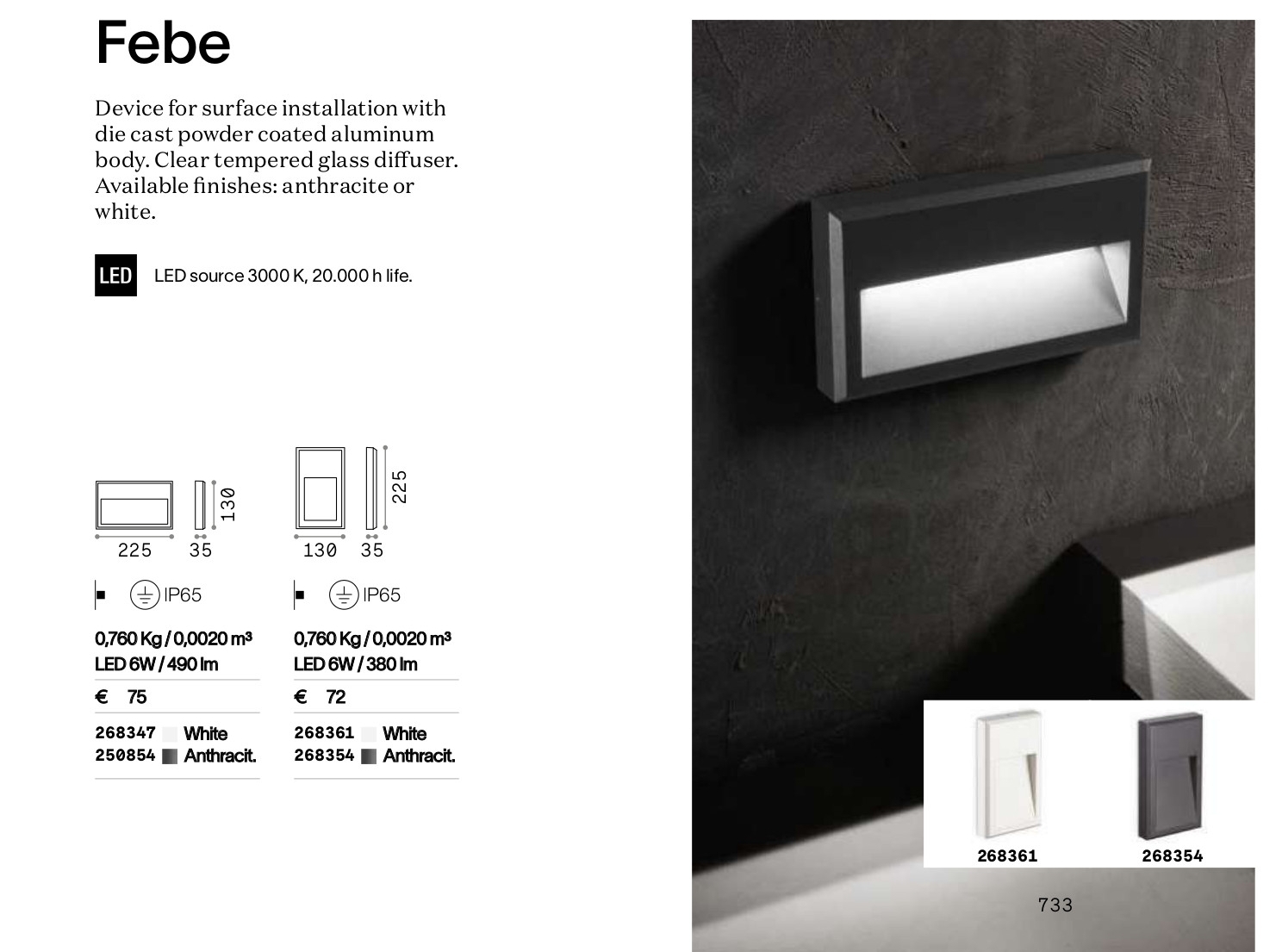 Осветителното тяло FEBE-1 AP BIANCO ще осигури комфорт и естетика във всяко помещение, в което се постави. Цялостната визия и дизайн на лампата и вложените в изработката й материали, като лят алуминий с прахово нанесено покритие в бял цвят, дифузер от прозрачно закалено стъкло, ще допринесат за един неповторим стил. Благодарение на дългогодишния опит, качествените материали и строгия контрол на качеството на изработка на производителя Ideal-Lux (Италия), FEBE-1 AP BIANCO е на високо европейско ниво.