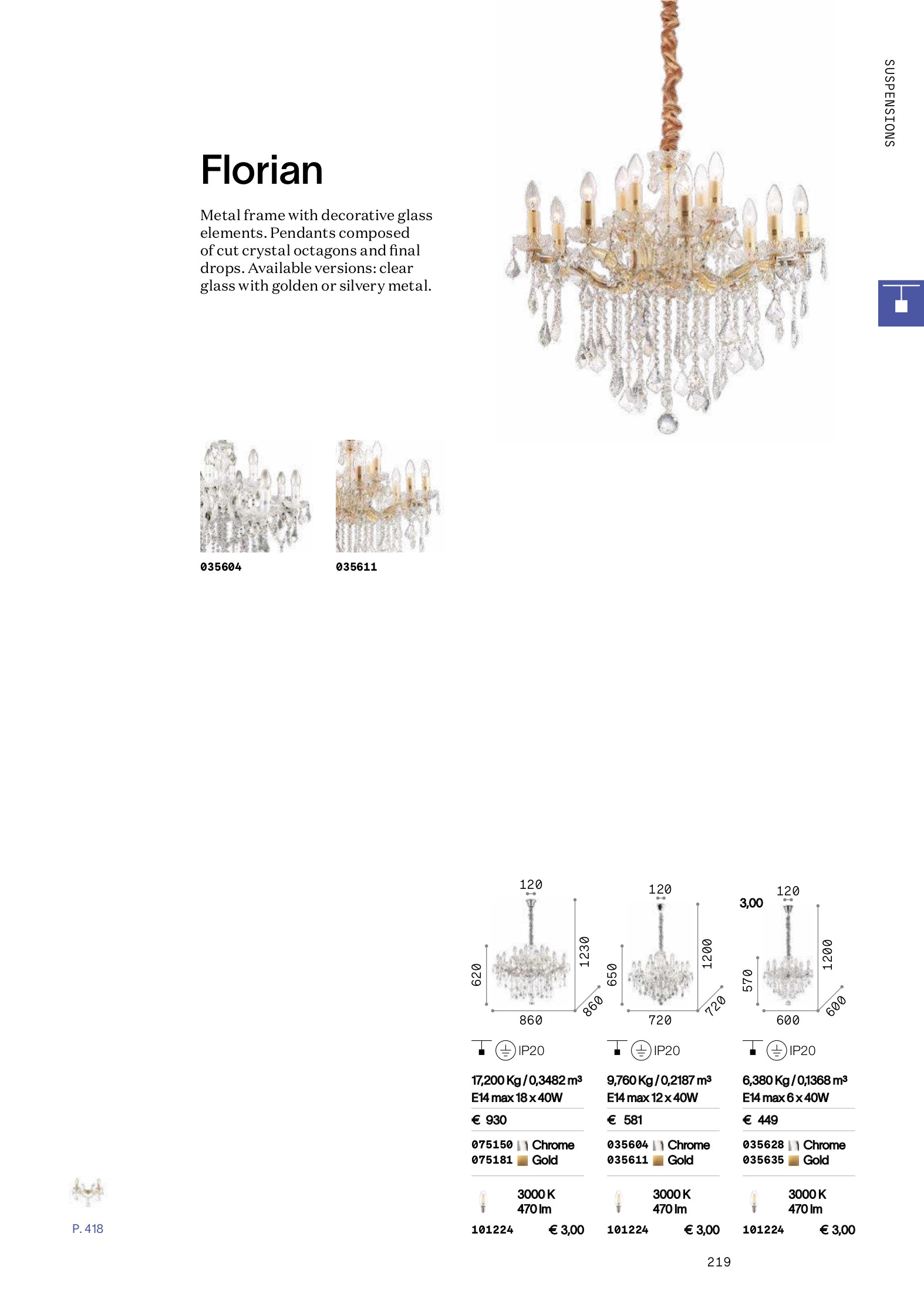 Магазини ОРИОН представят осветителното тяло FLORIAN SP18 ORO, което представлява полилей в класически стил. Лампата е част от категорията полилеи и е подходяща за различни помещения и пространства, като например всекидневна / хол, спалня, кухня, трапезария, офис.