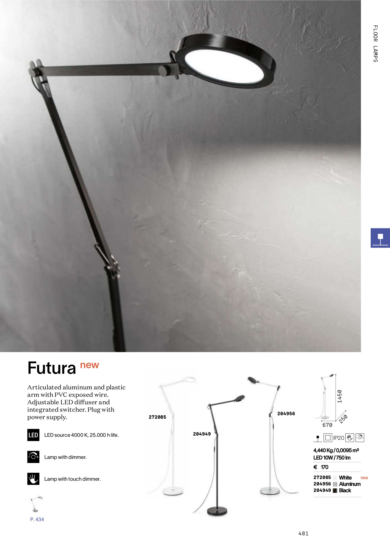 Лед лампион / правостояща лампа FUTURA PT1 ALLUMINIO ще осигури комфорт и естетика във всяко помещение, в което се постави. Цялостната визия и дизайн на led лампата и вложените в изработката й материали, като шарнир от полимер в черен цвят алуминиеви рамена, насочваем LED дифузьор, ключ ON/OFF и щепсел, димер с докосване, ще допринесат за един неповторим стил. Благодарение на дългогодишния опит в производството на лед осветление, качествените материали и строгия контрол на качеството на изработка на производителя Ideal-Lux (Италия), FUTURA PT1 ALLUMINIO е на високо европейско ниво.
